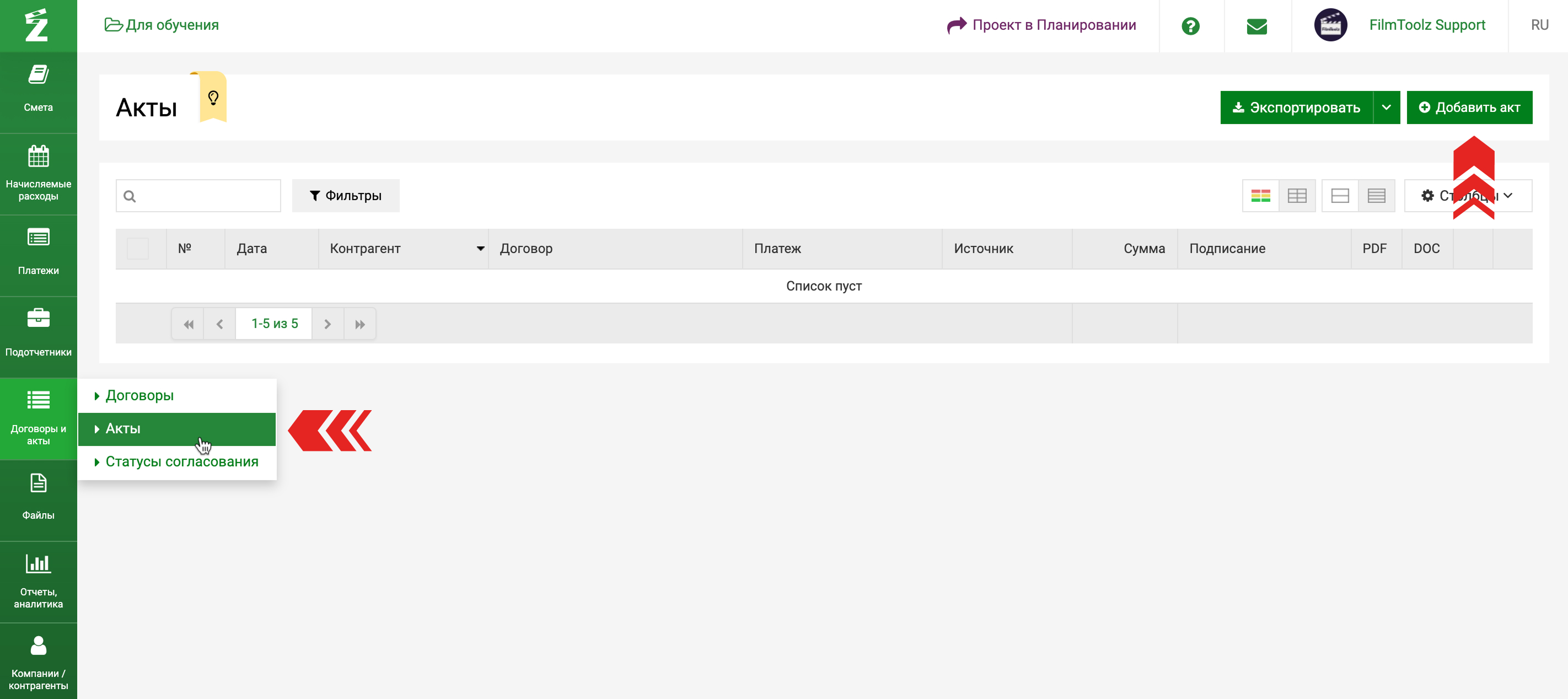 В FilmToolz реализована возможность хранения и учета актов выполненных работ с контрагентами - чаще всего их добавление осуществляется со страницы соответствующего договора, однако также имеется возможность создания акта без договора с возможностью привязки его к конкретному платежу.