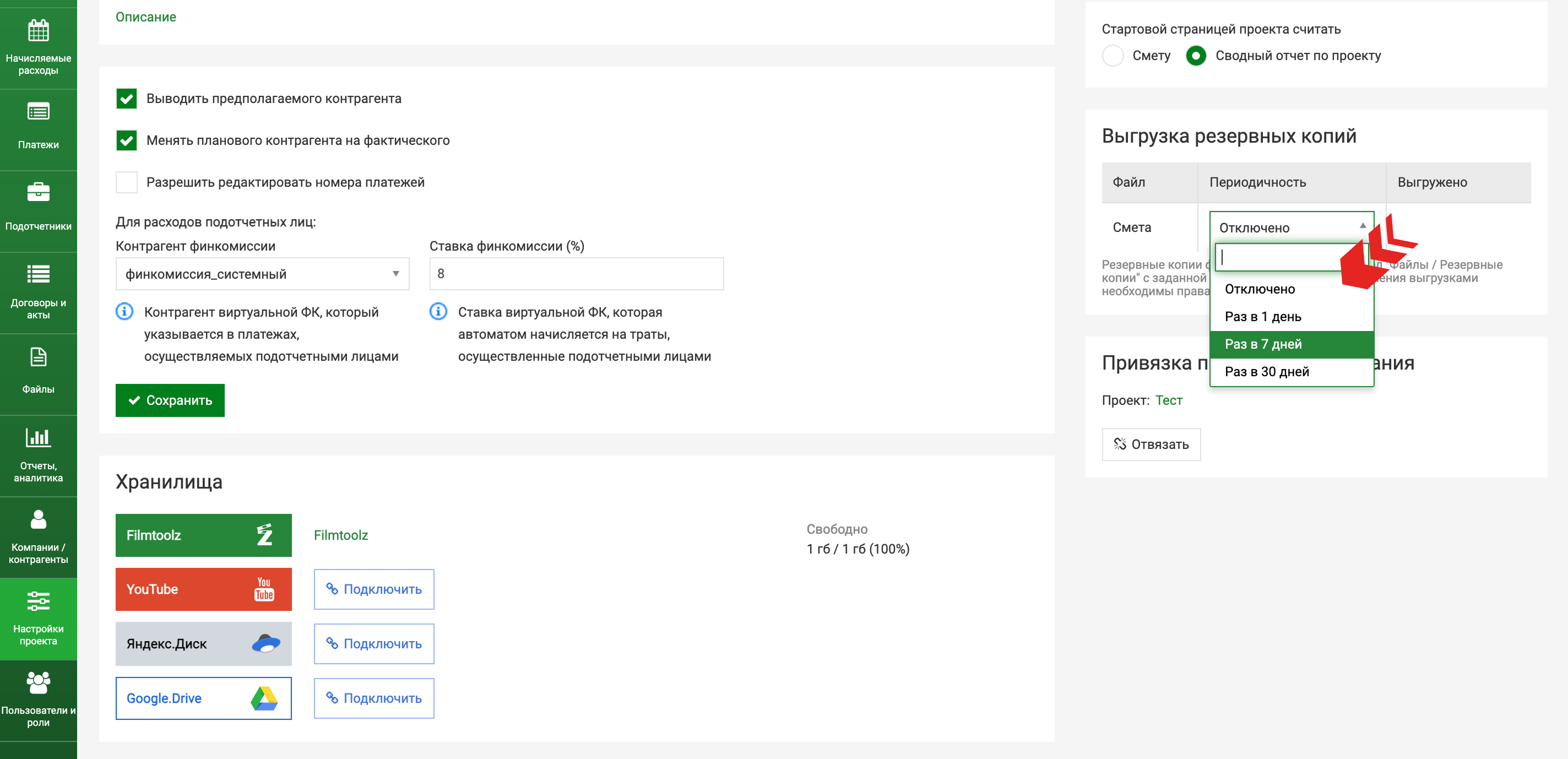 Вы можете настроить выгрузку резервных копий сметы вашего проекта. Для этого задайте необходимую периодичность - раз в 1, 7 или 30 дней и сохраните.
