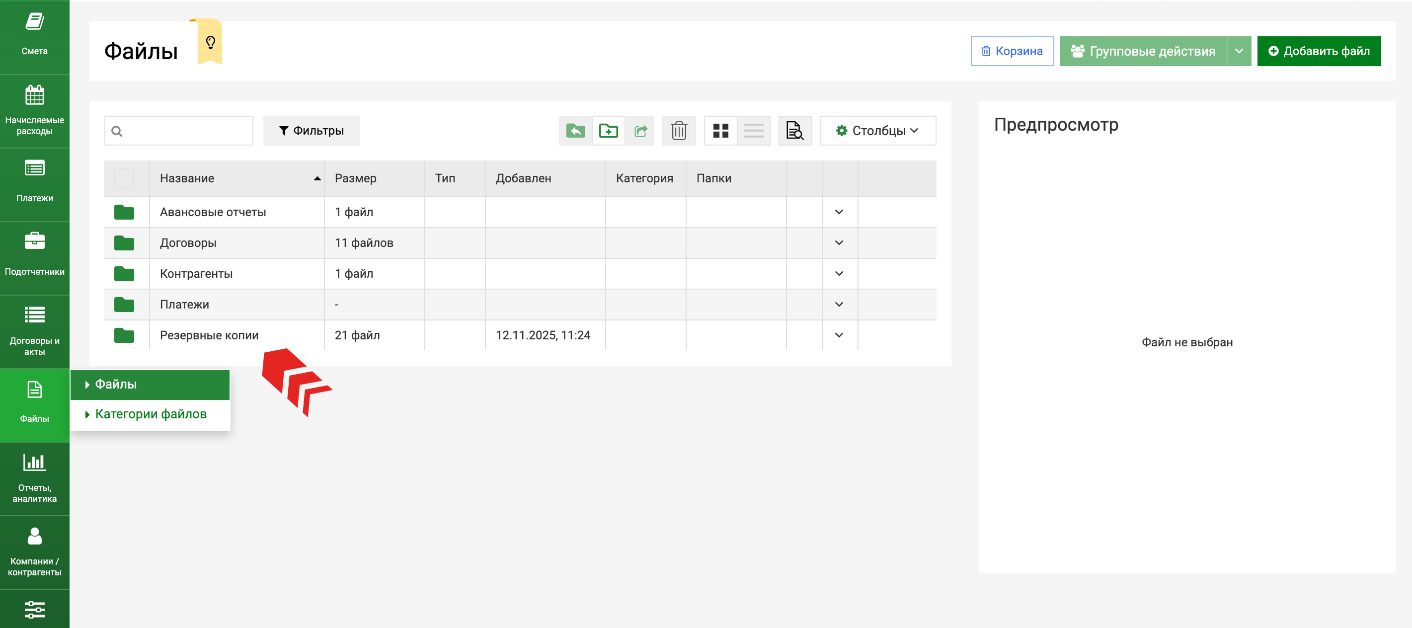 После этого файлы в формате excel будут автоматически выгружаться с заданной периодичностью в папку "Резервные копии" в разделе Файлы, где вы сможете просматривать и скачивать их.