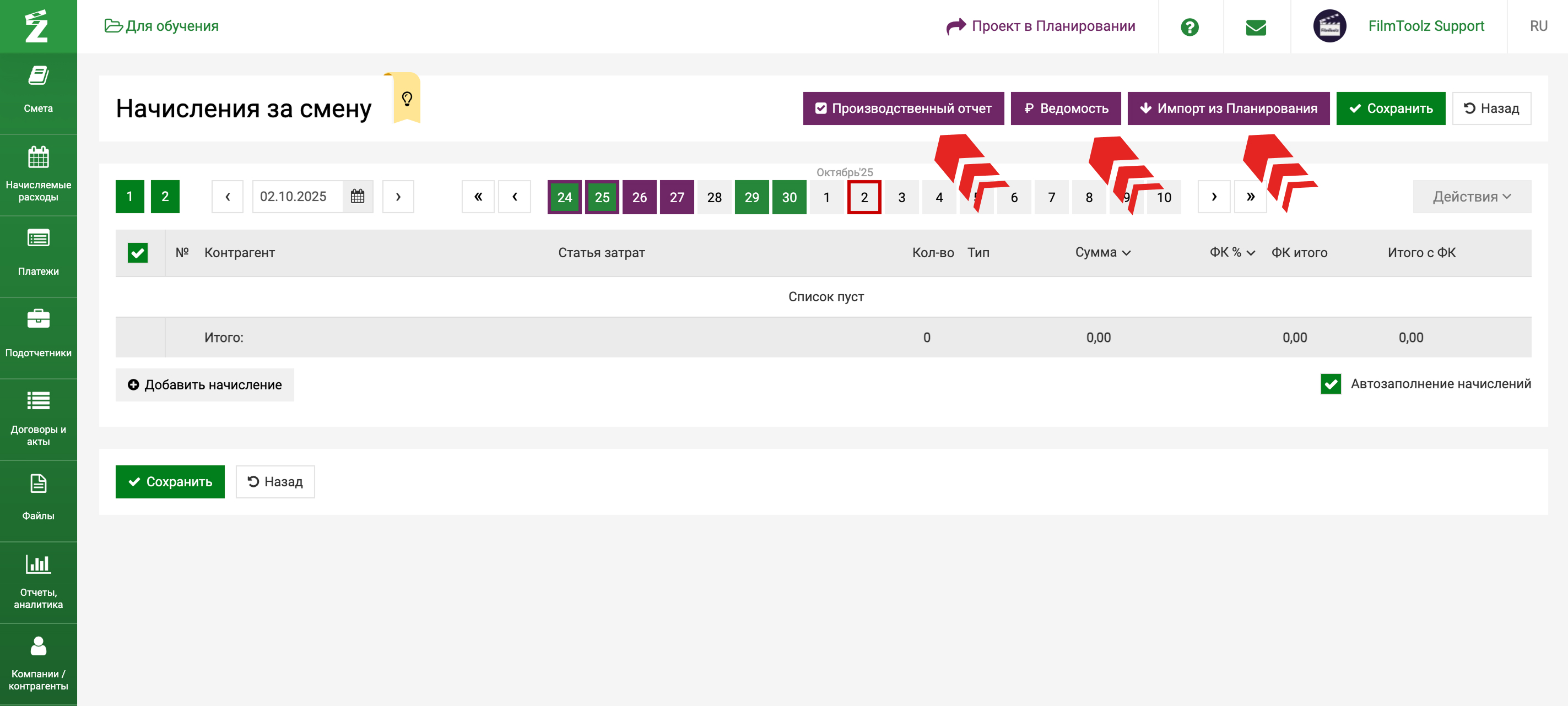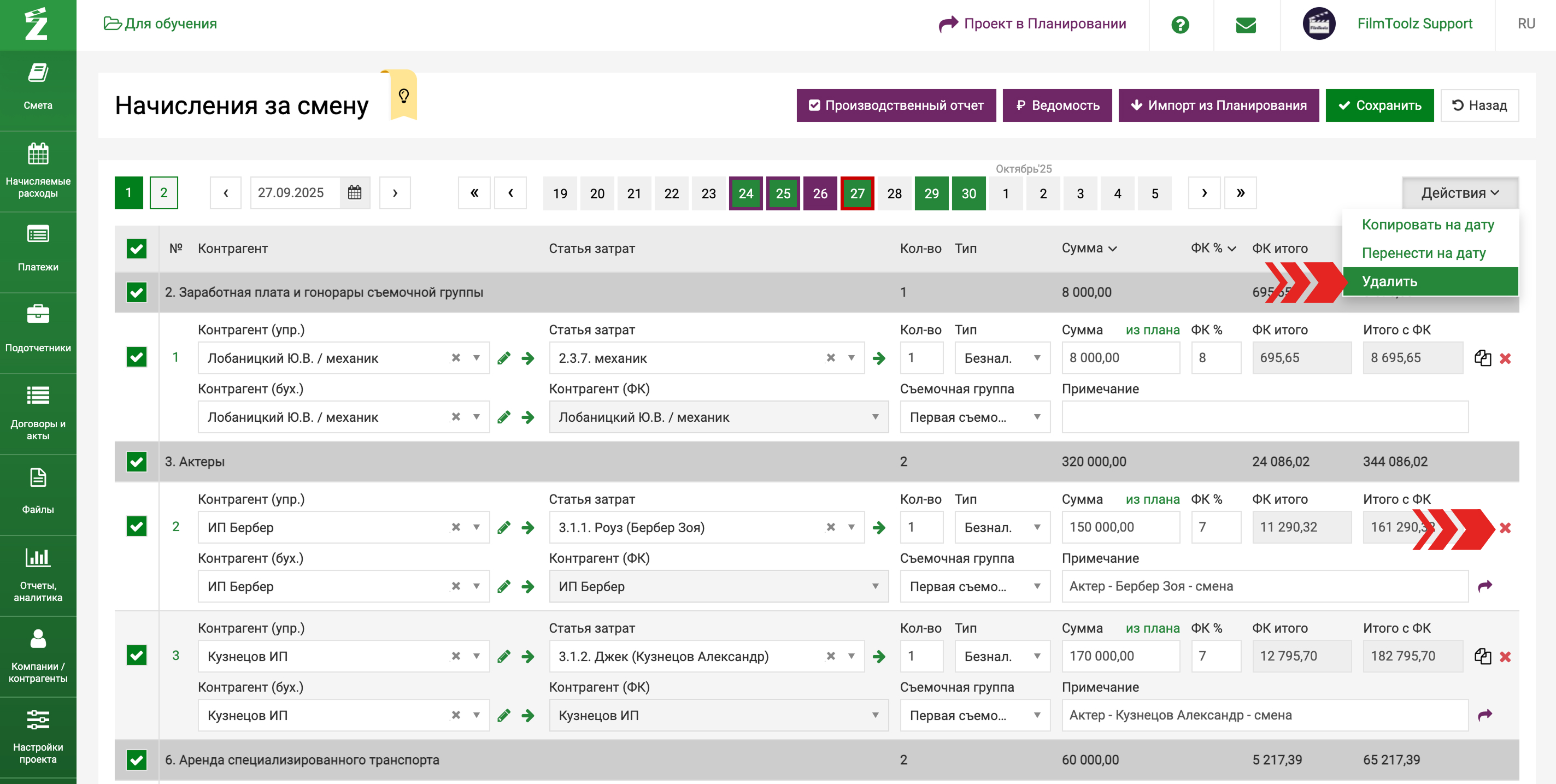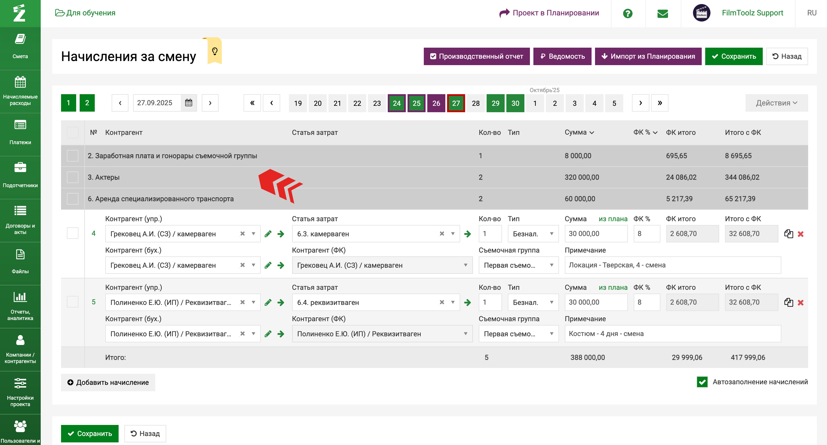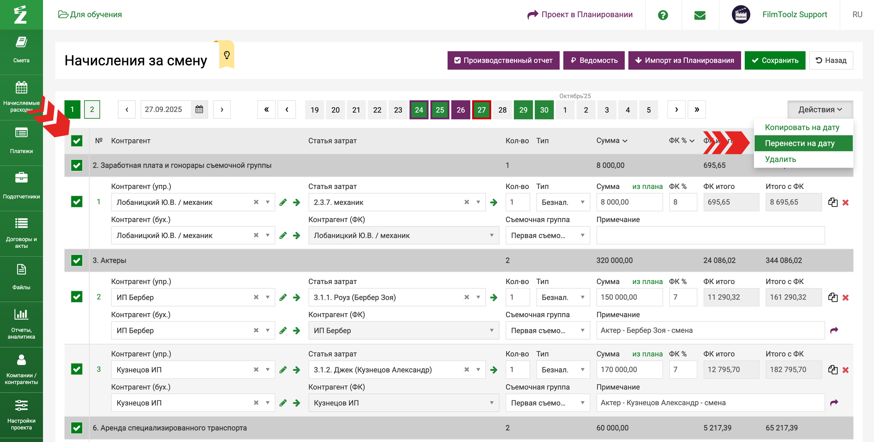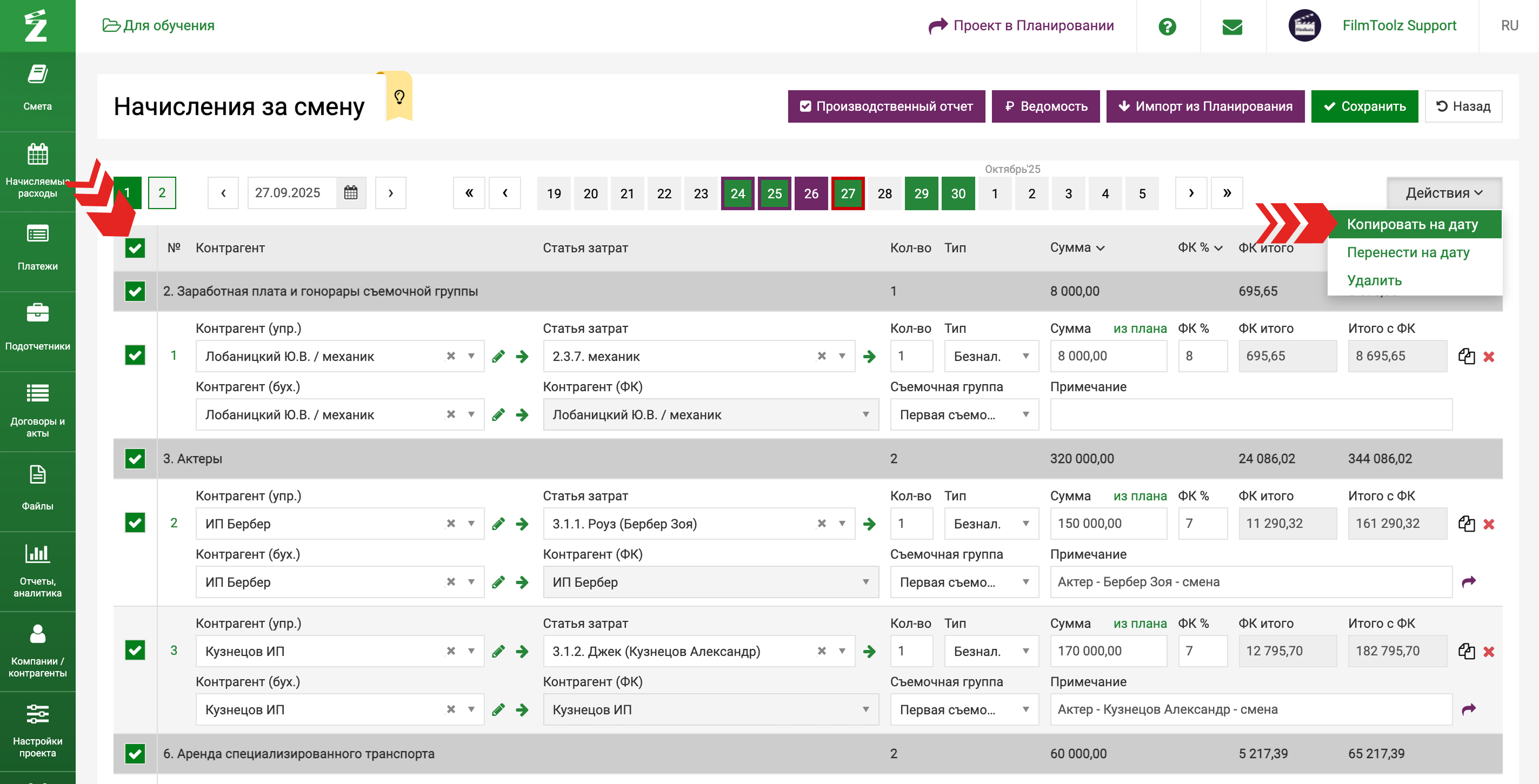 Так как многие посменные расходы (аренда камеры, света, транспорта, а также гонорары технического персонала) зачастую остаются одинаковыми в разные даты, мы разработали удобную форму для их оптового добавления, копирования и переноса с даты на дату, а также импорта из модуля планирования.