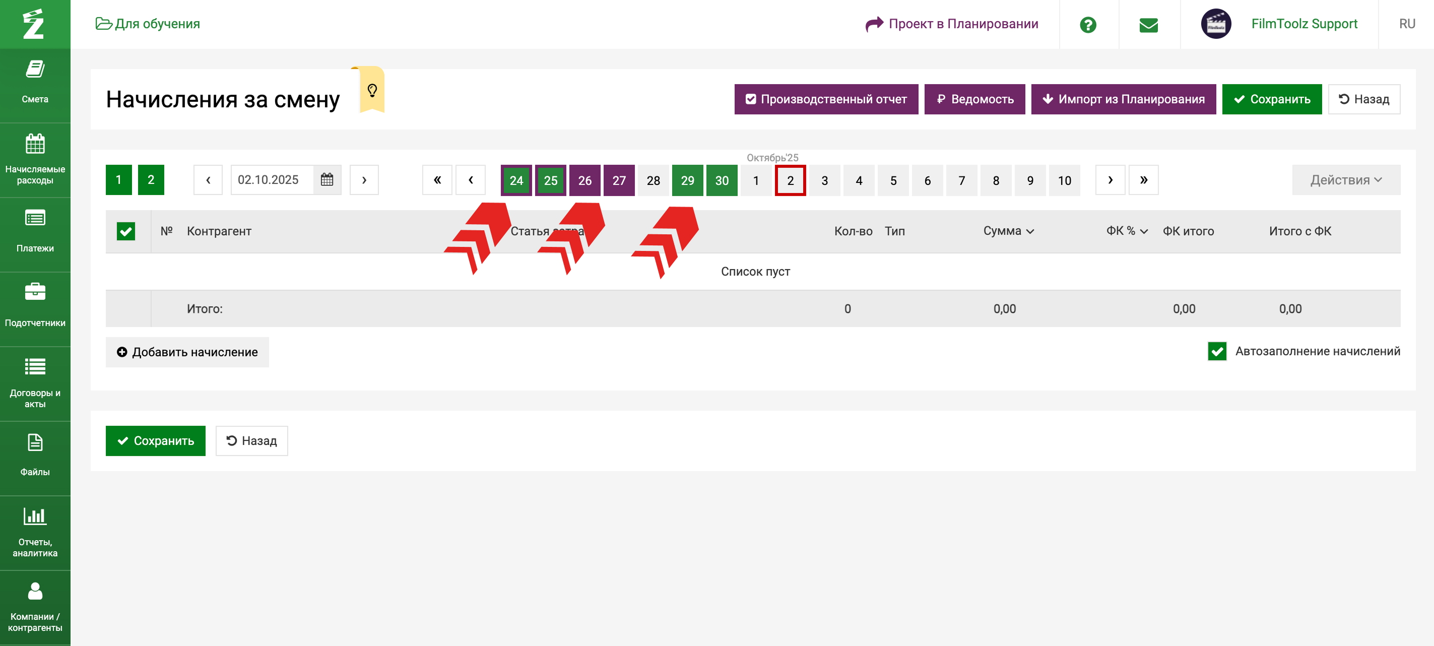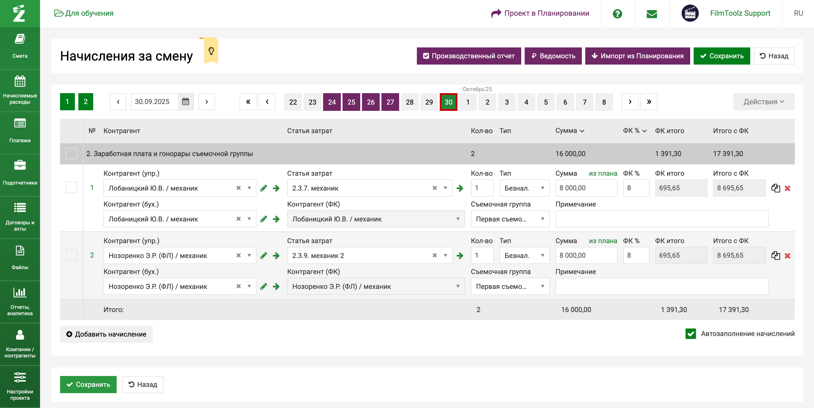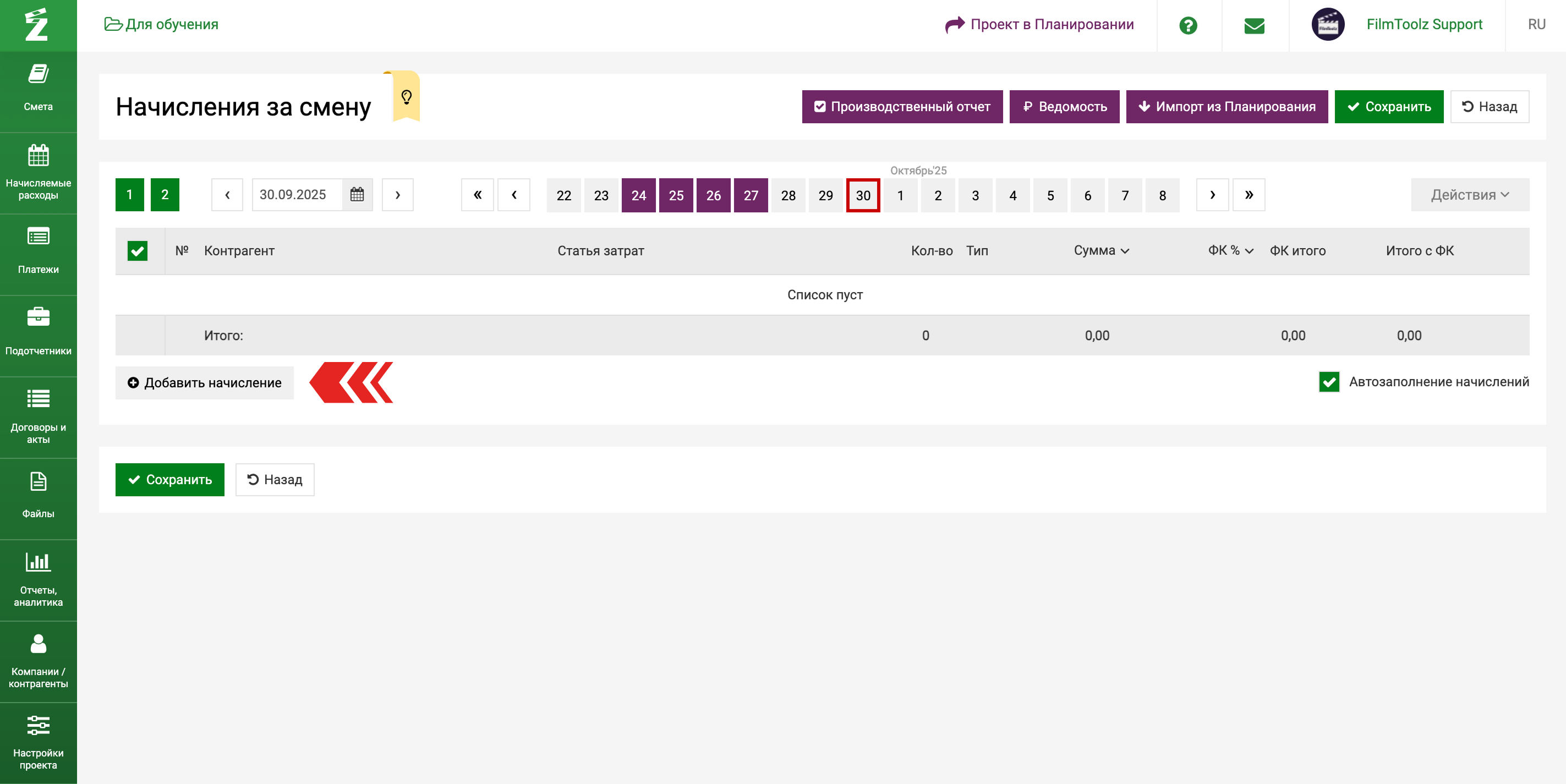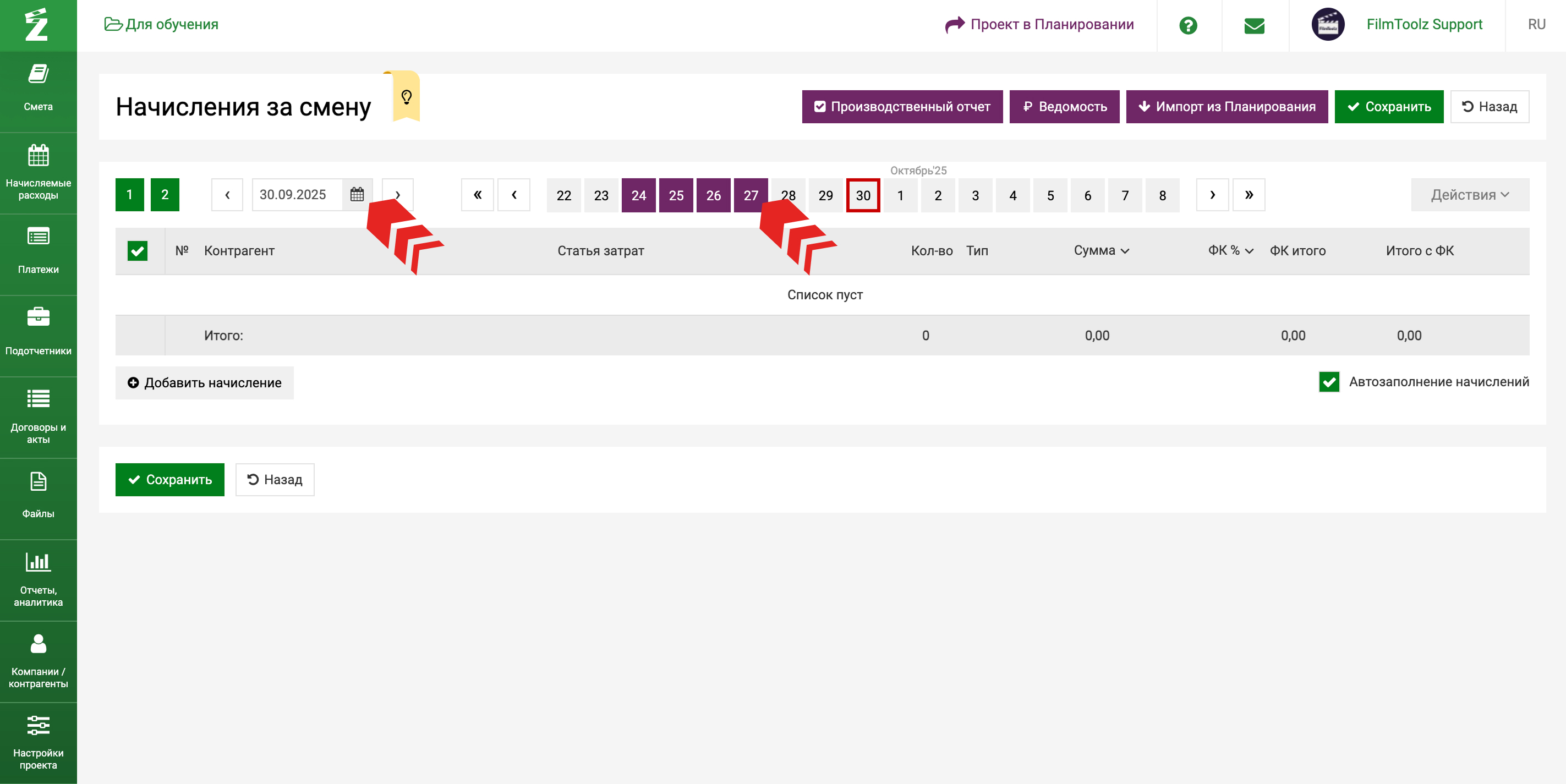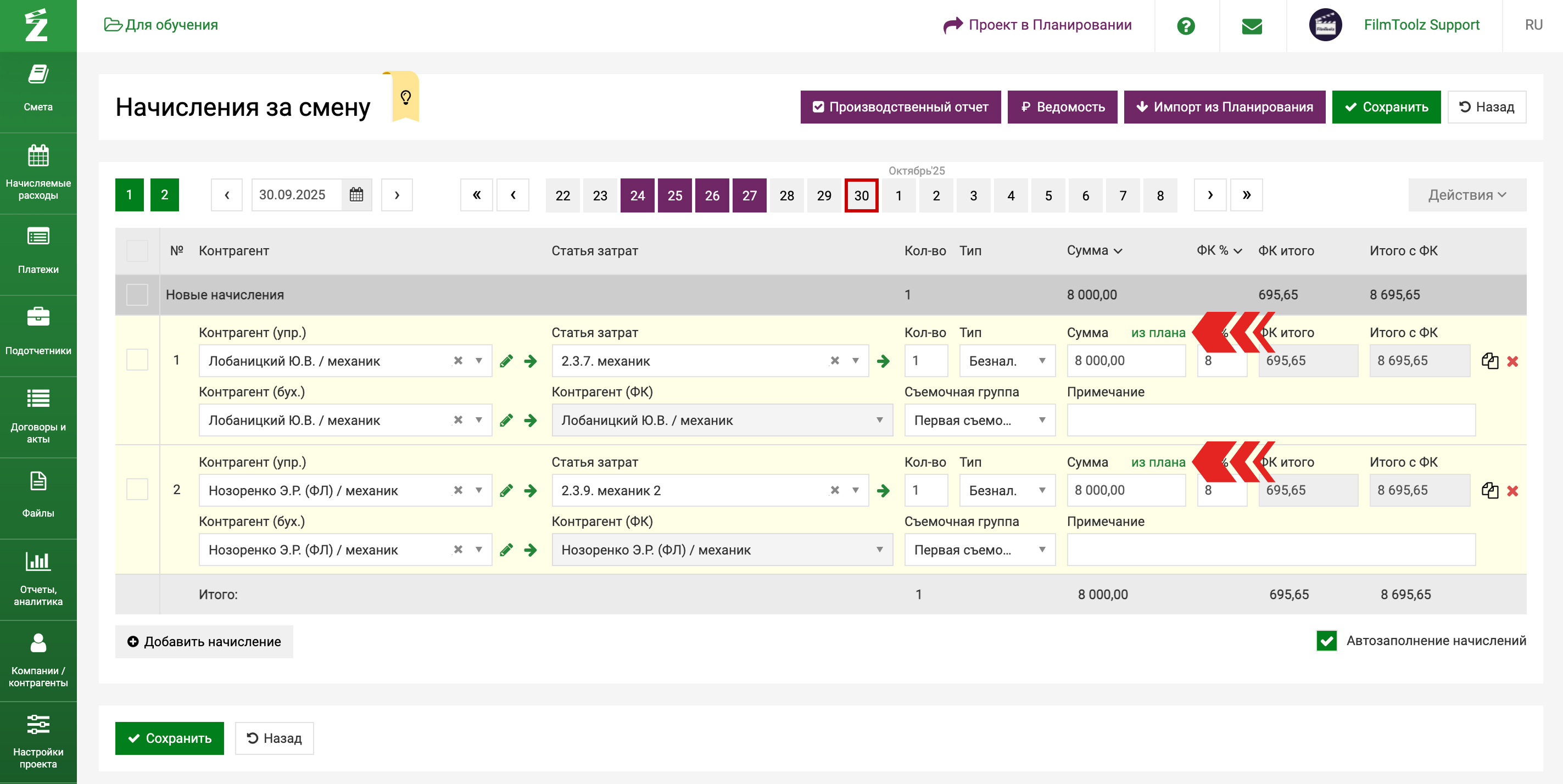 Так как многие посменные расходы (аренда камеры, света, транспорта, а также гонорары технического персонала) зачастую остаются одинаковыми в разные даты, мы разработали удобную форму для их оптового добавления, копирования и переноса с даты на дату, а также импорта из модуля планирования.
