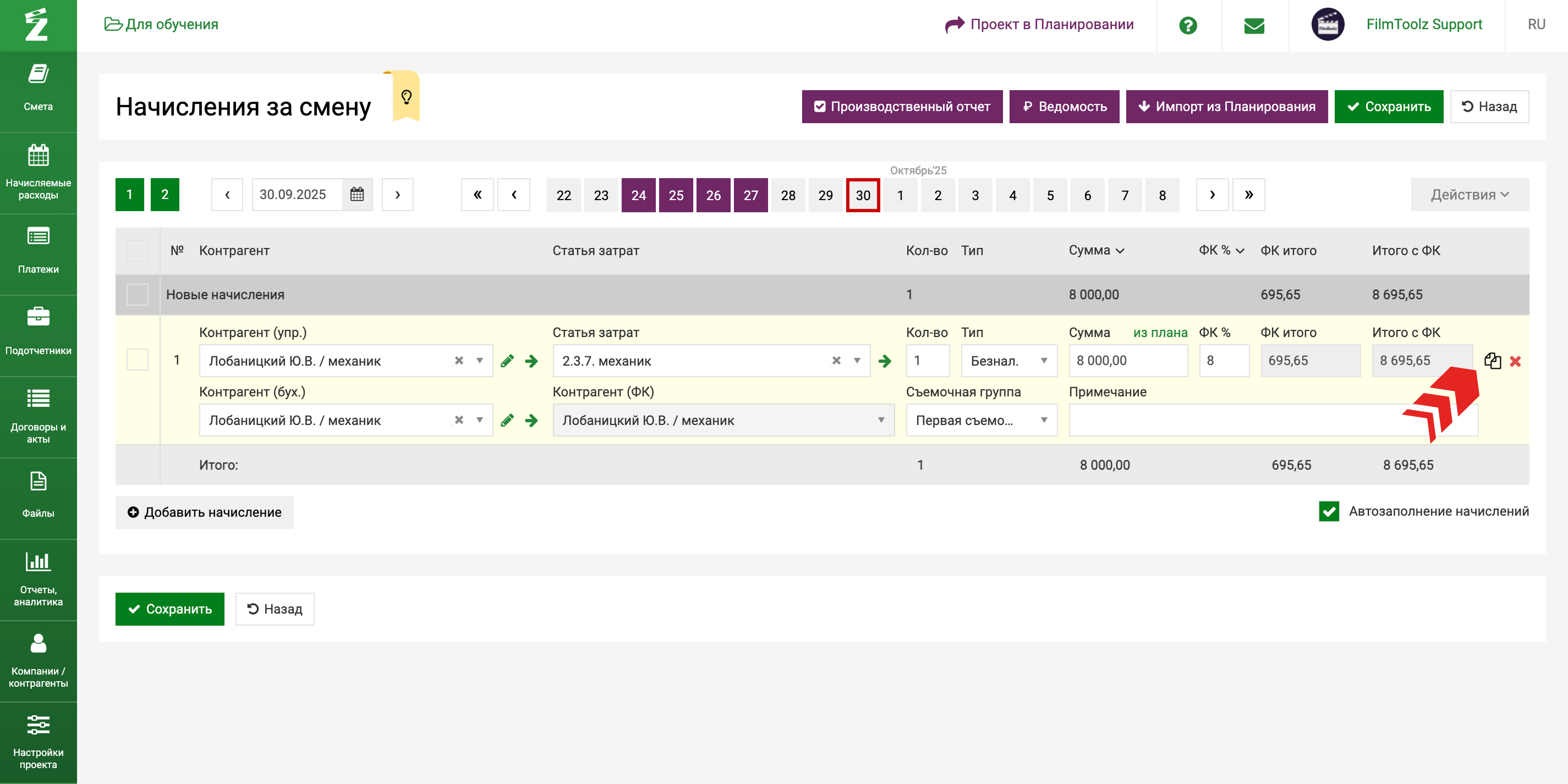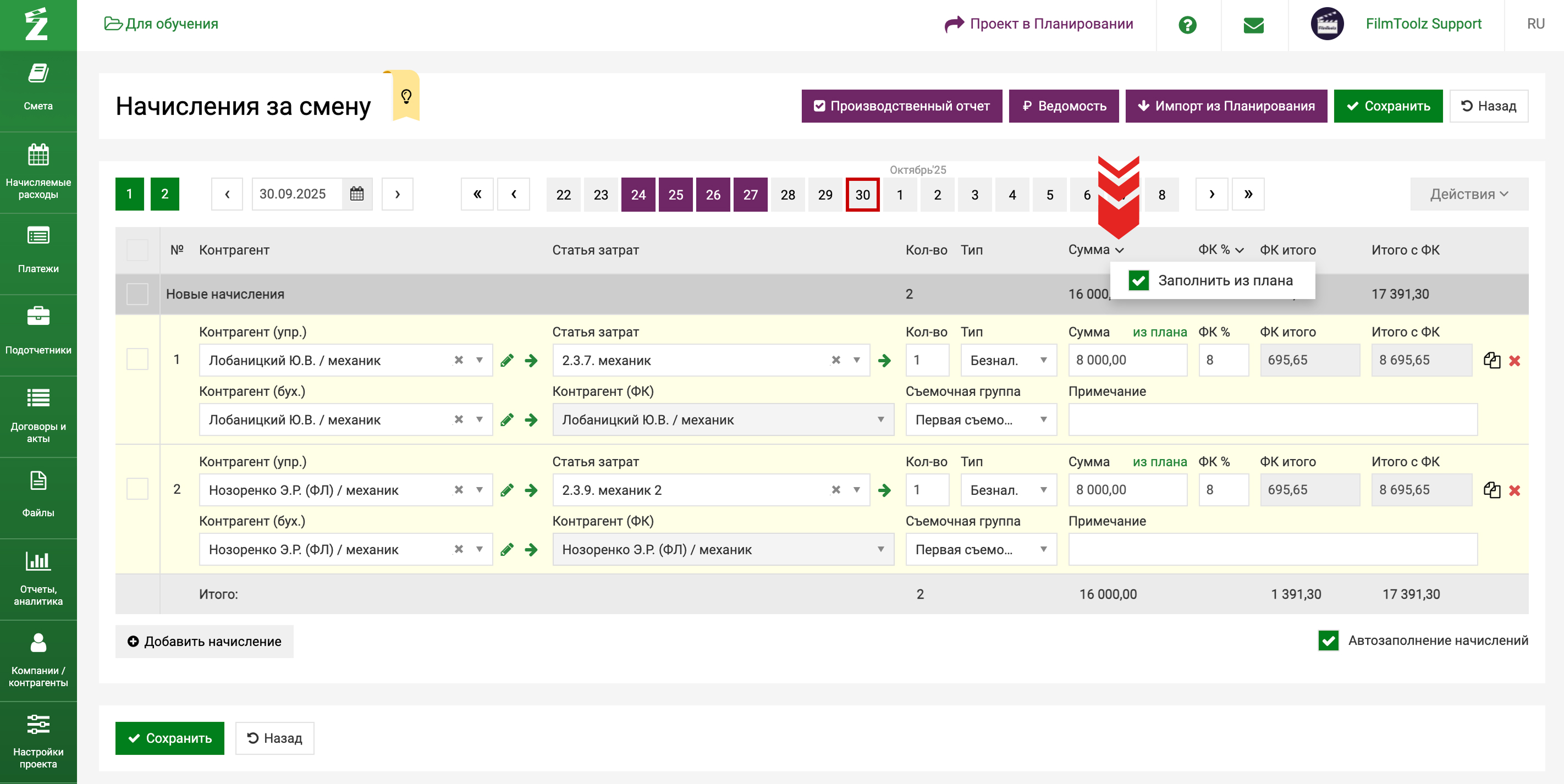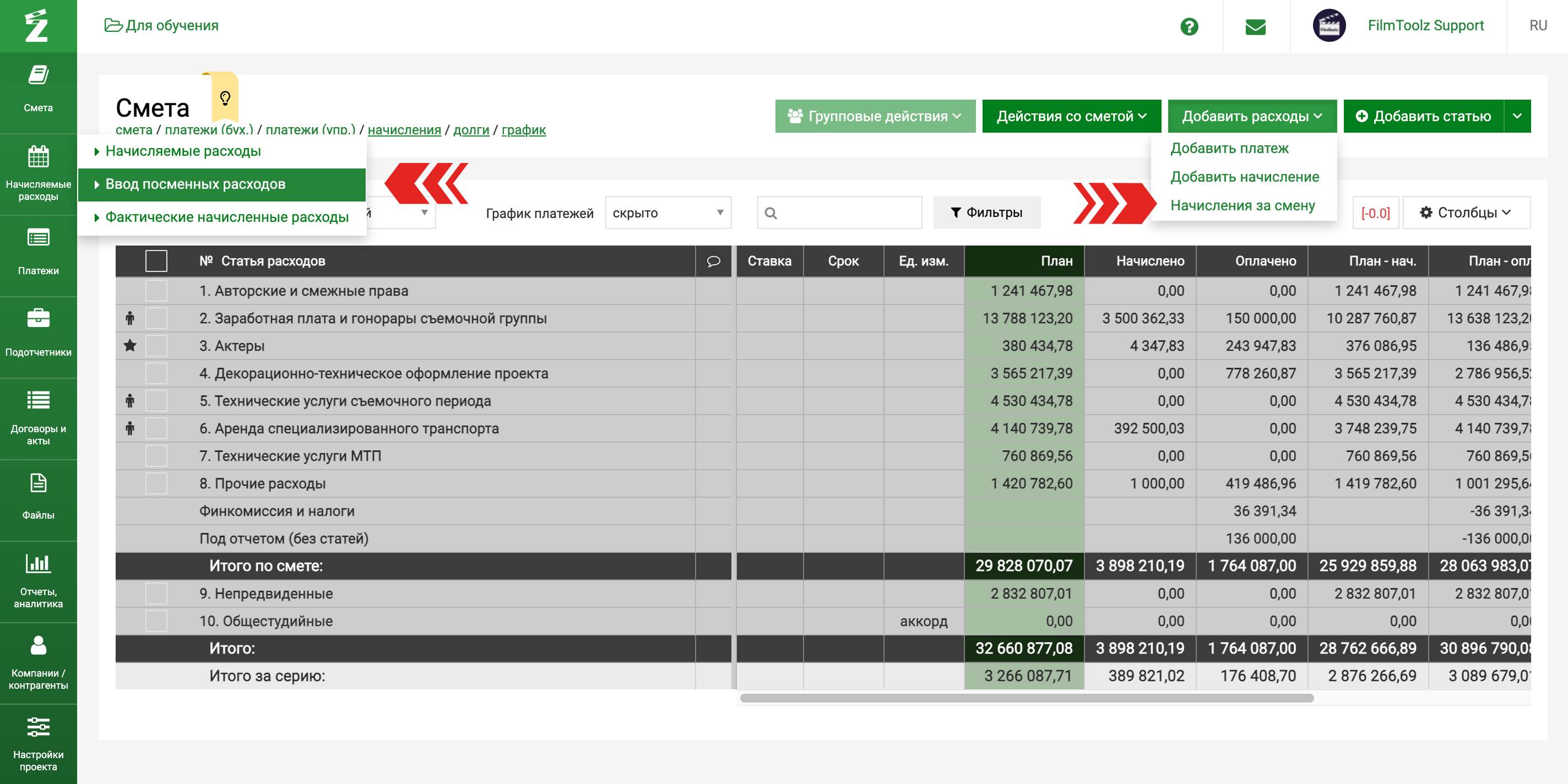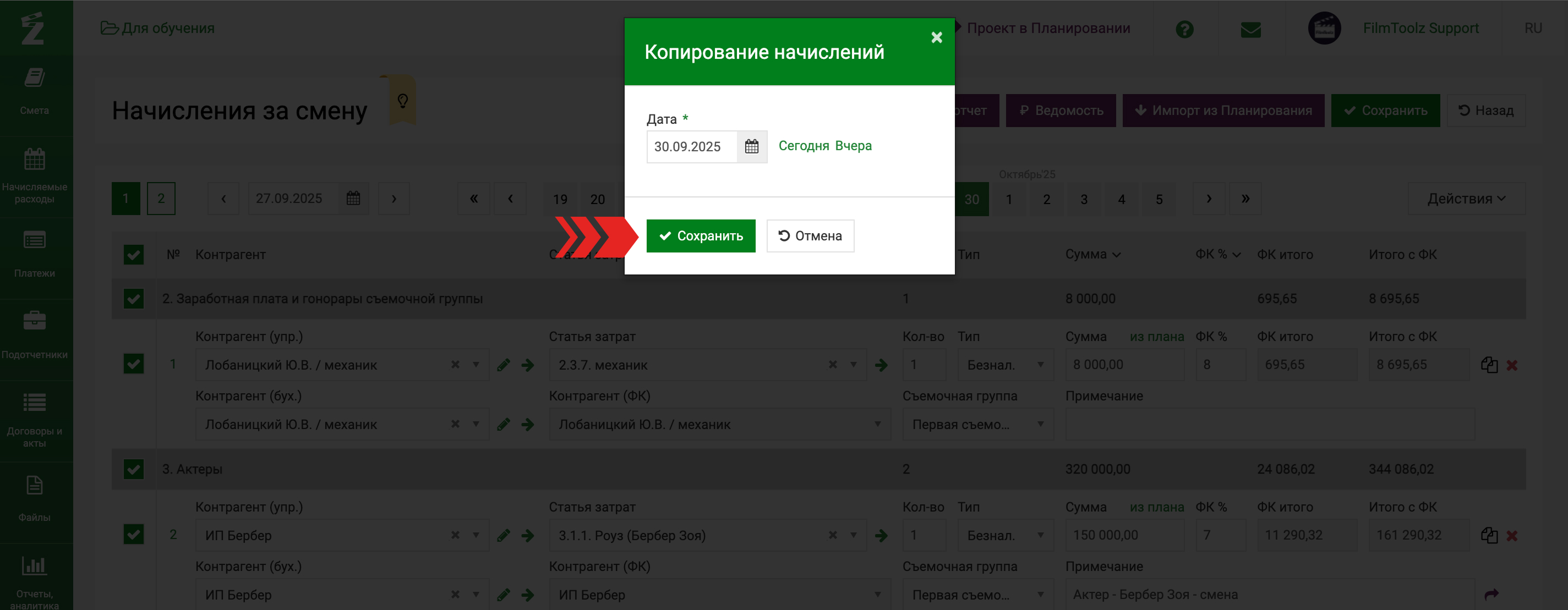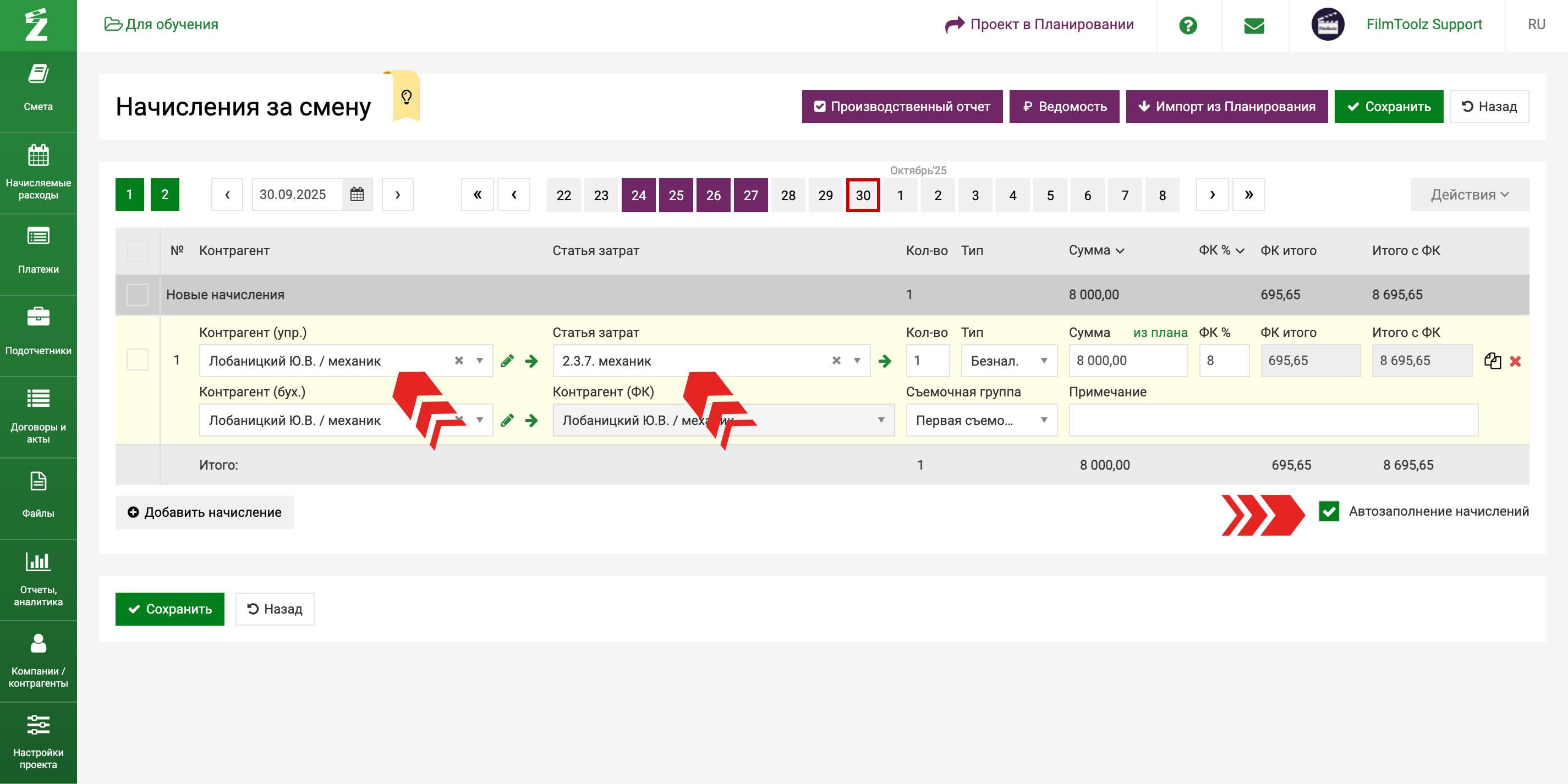 Так как многие посменные расходы (аренда камеры, света, транспорта, а также гонорары технического персонала) зачастую остаются одинаковыми в разные даты, мы разработали удобную форму для их оптового добавления, копирования и переноса с даты на дату, а также импорта из модуля планирования.