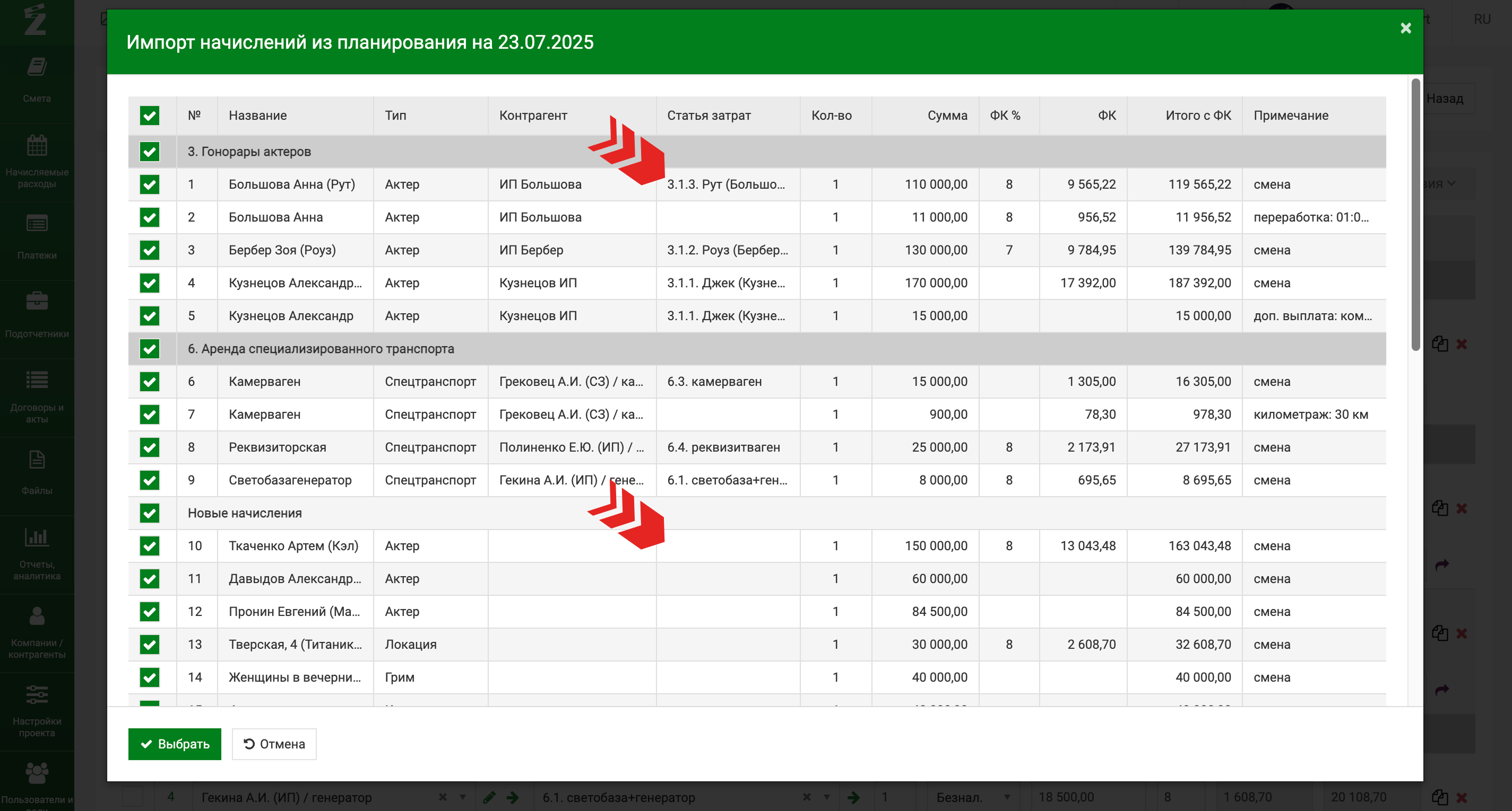 Для импорта начислений нажмите «Импорт из планирования». Перед вами откроется окно, где будут отображены начисления по актерам, локациям и ресурсам, у которых есть связанные статьи в смете, а также начисления без связных статей. О том, как связать статьи, вы можете узнать из отдельного урока.