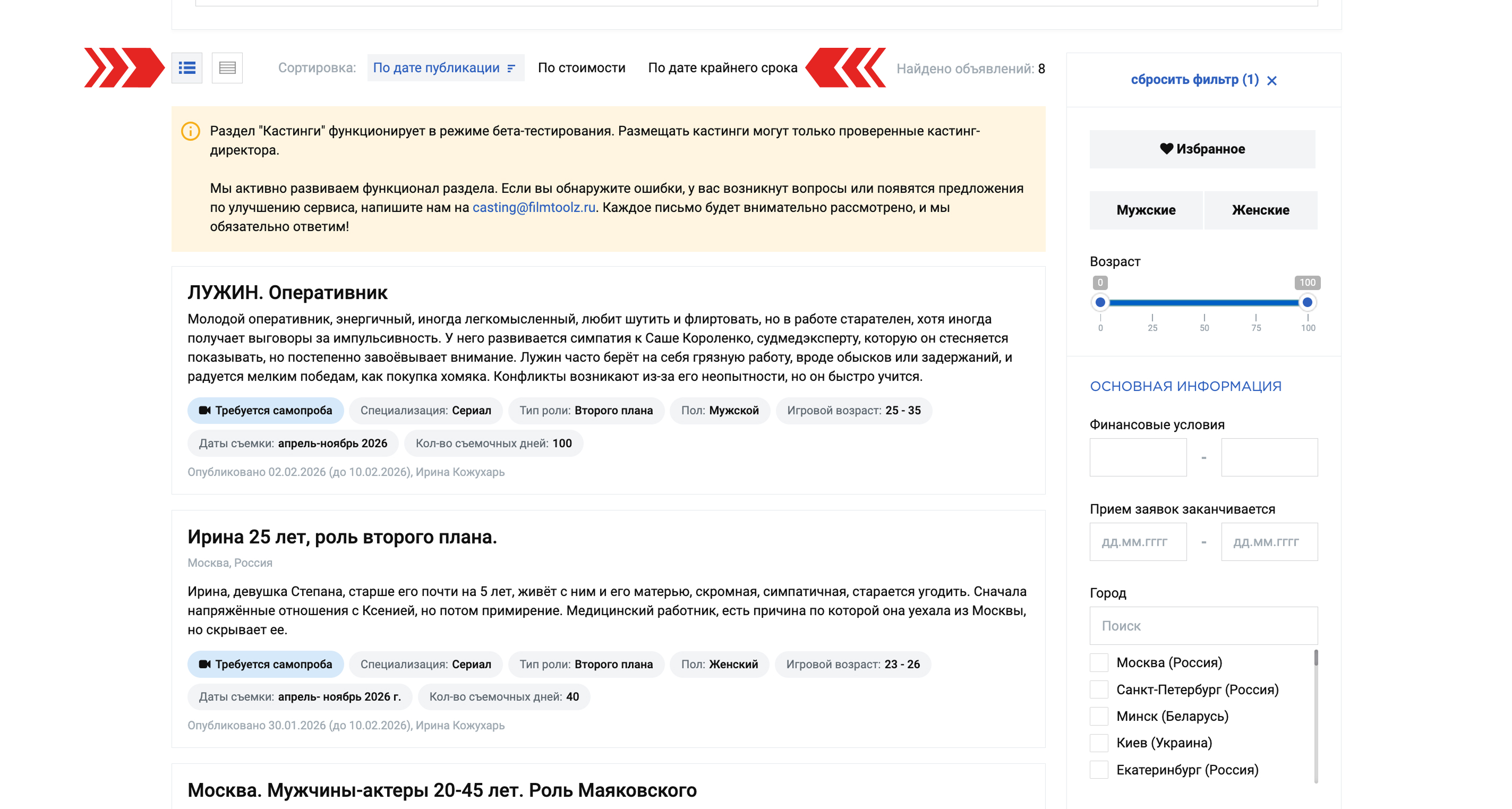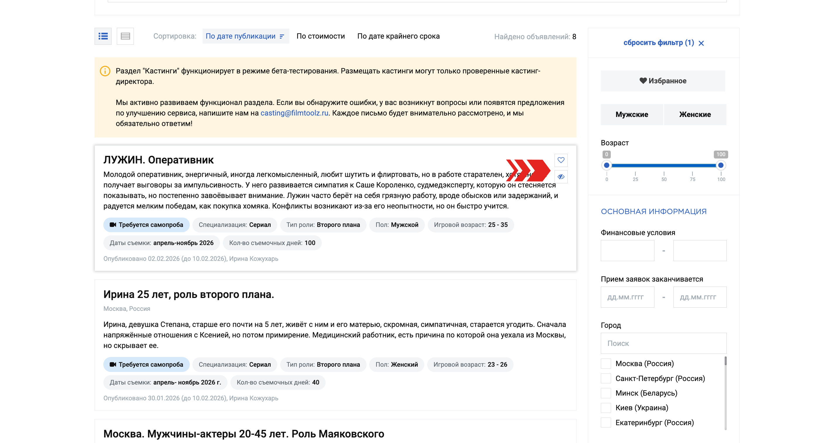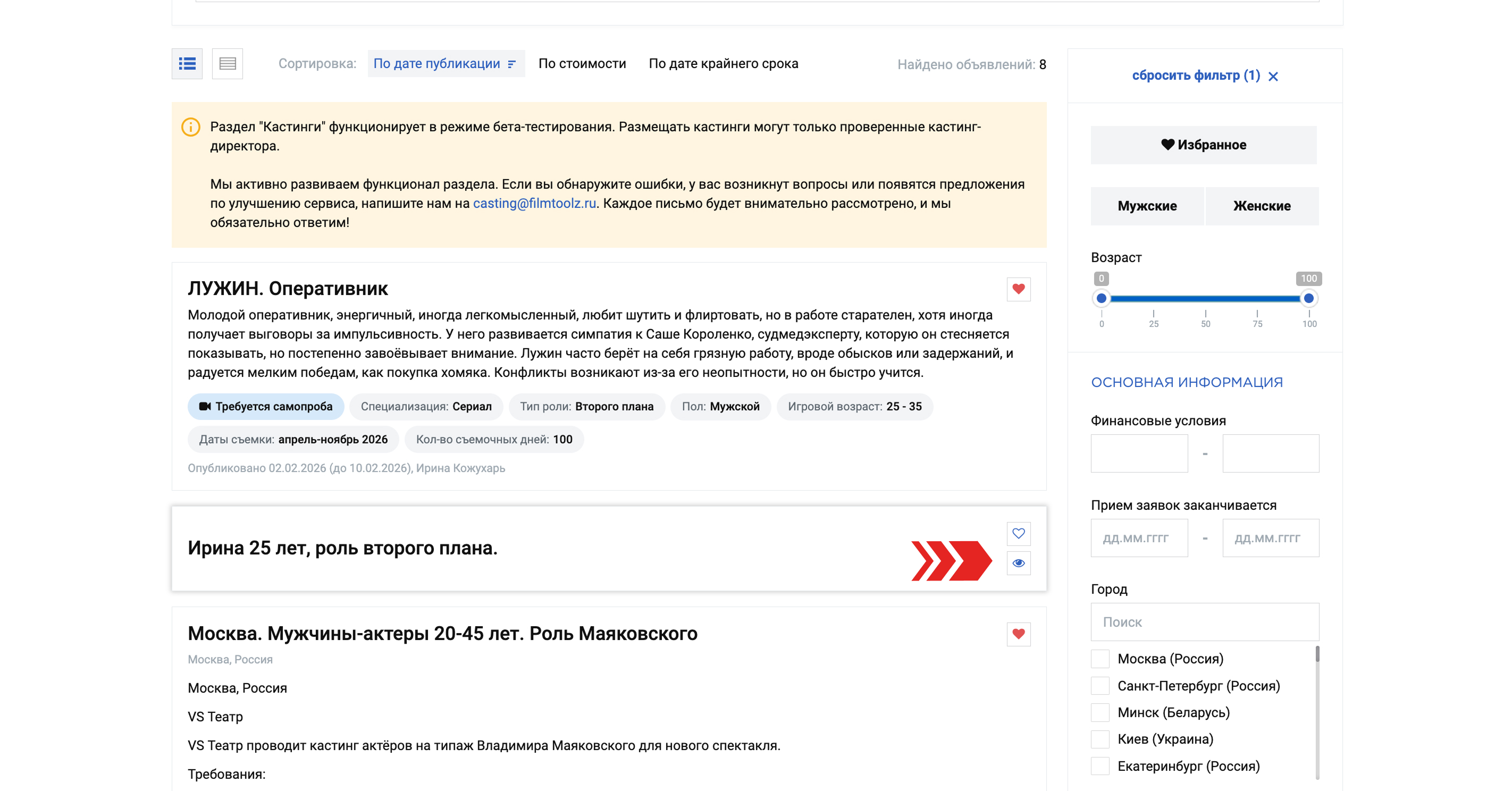 Для просмотра актуальных объявлений перейдите в раздел "Кастинги" в верхнем меню
