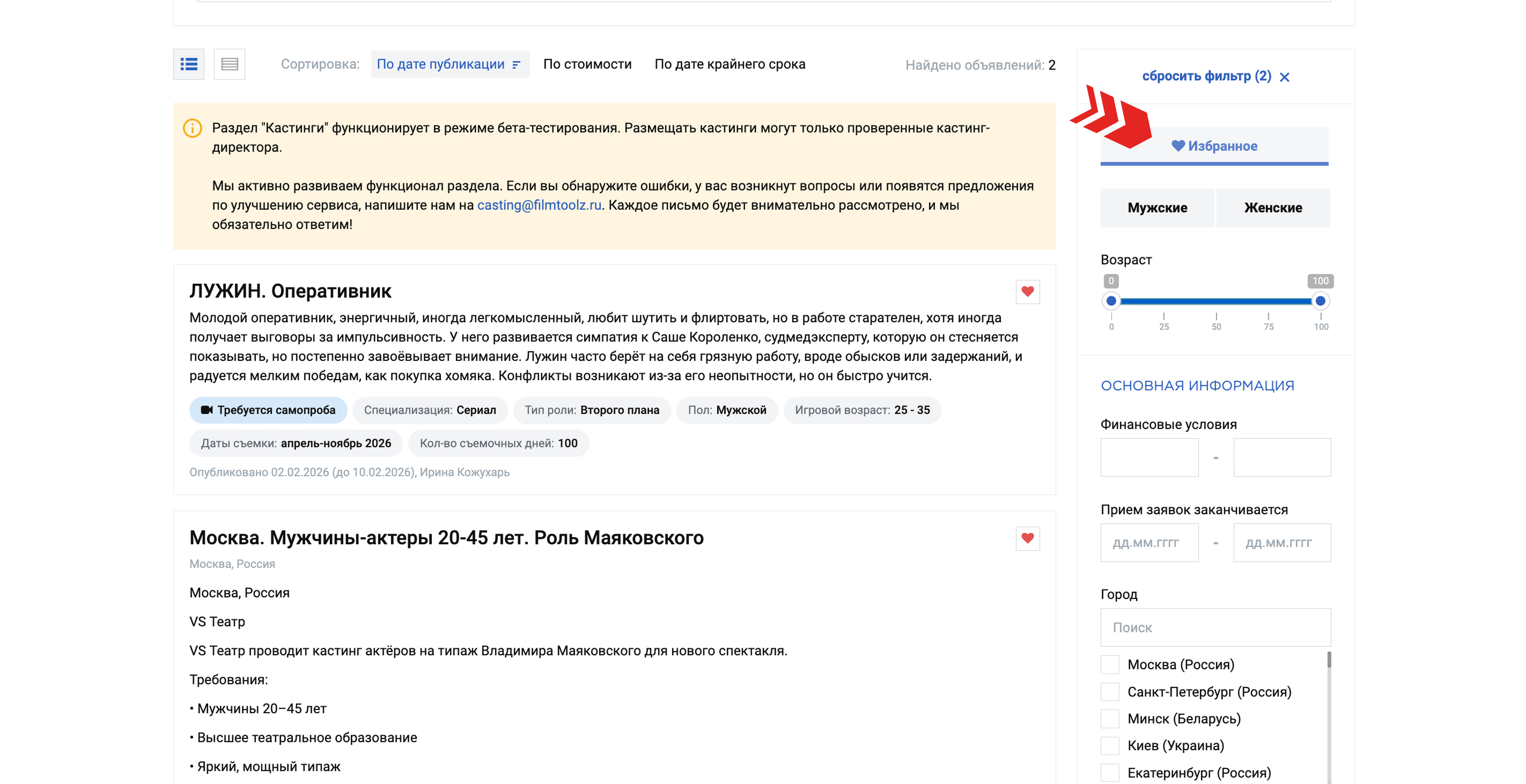 Далее вы сможете просматривать избранные кастинги, воспользовавшись соответствующим фильтром в правой панели.