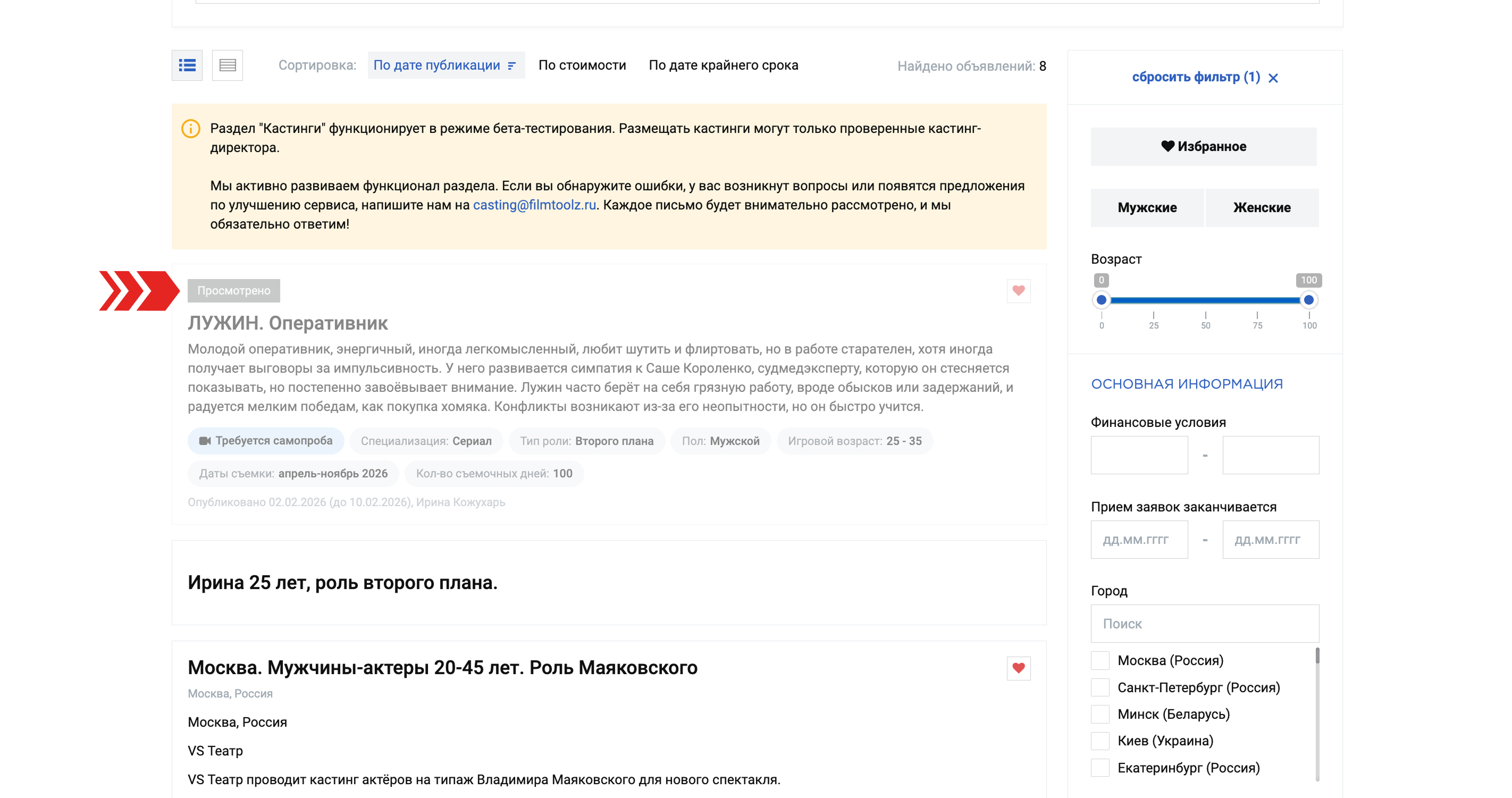 Все кастинги, которые вы открыли и просмотрели отображаются приглушенным шрифтом с плашкой Просмотрено.