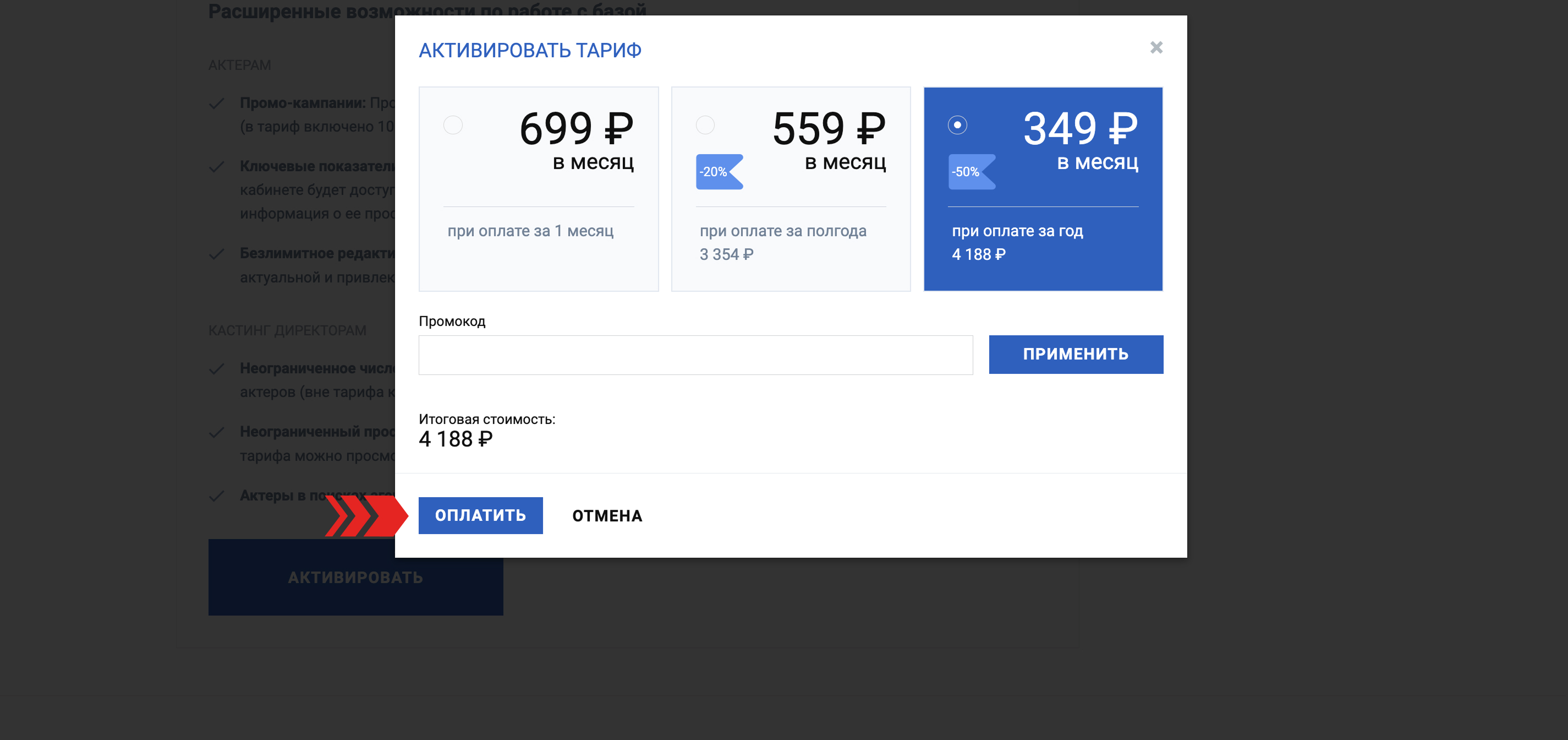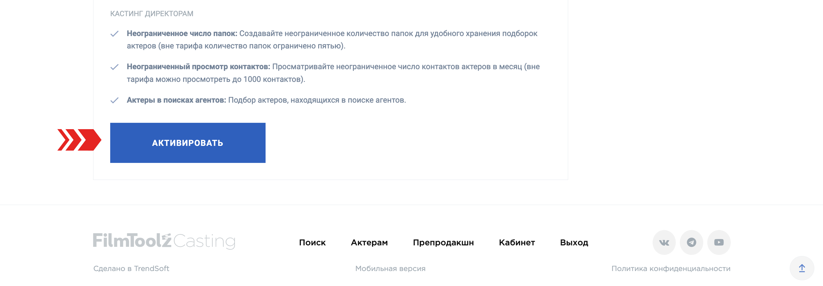 - Возможность просмотра неограниченного числа контактов актеров в месяц (вне тарифа можно просмотреть до 1000 контактов).