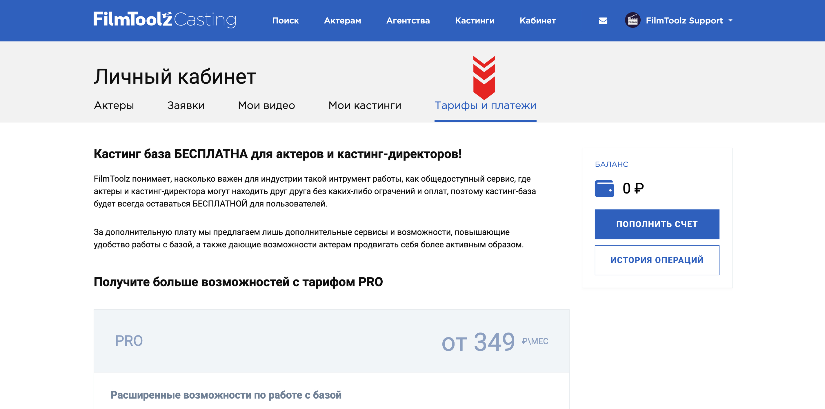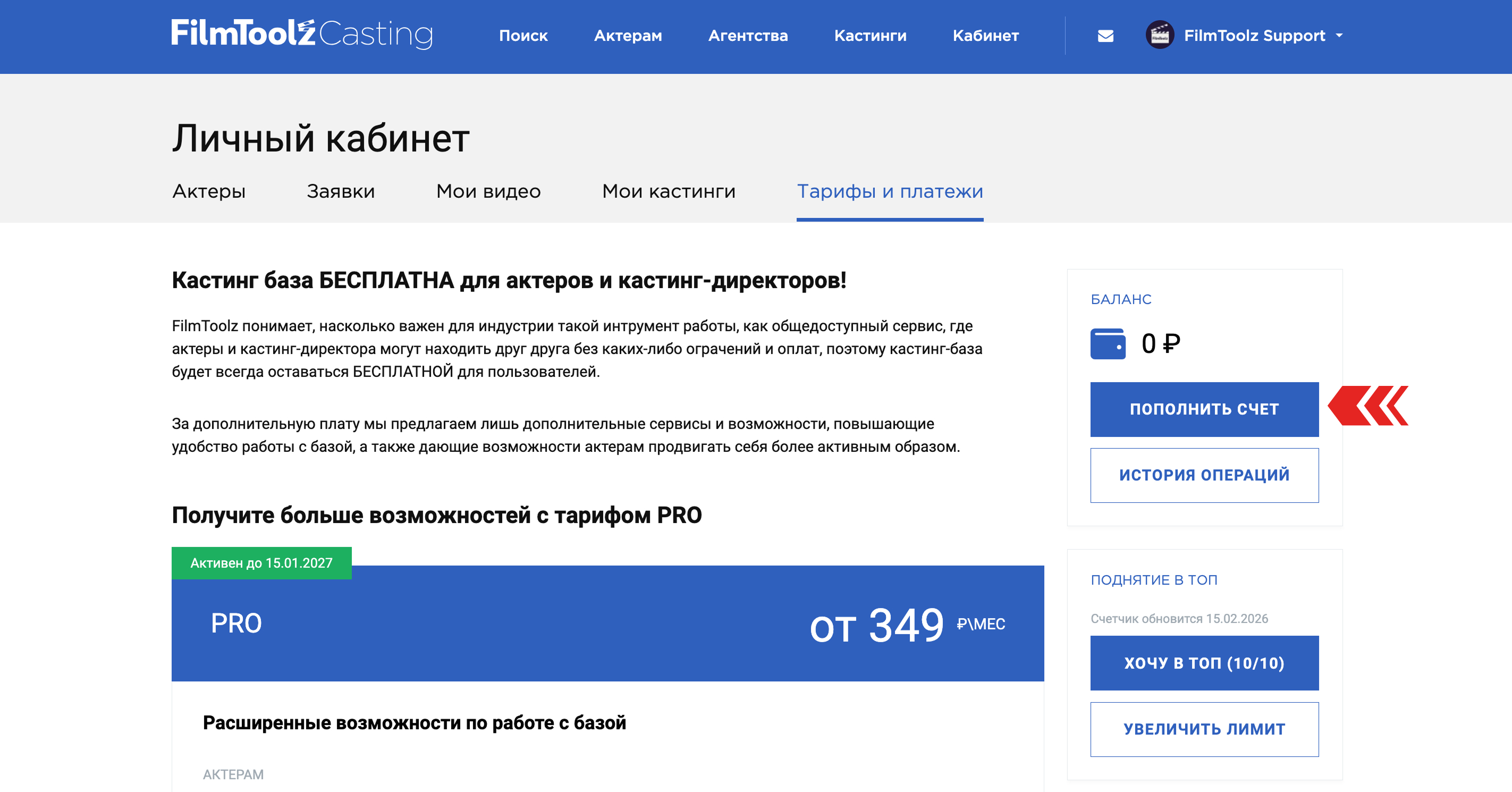 Помимо прямой активации тарифа PRO, вы можете пополнить счет вашего аккаунта на любую сумму и использовать эти средства в дальнейшем для активации или продления тарифа PRO, а также для докупа поднятий анкеты и ускоренной модерации вашей актерской заявки. Для этого нажмите "Пополнить счет" и положите на него необходимую сумму.