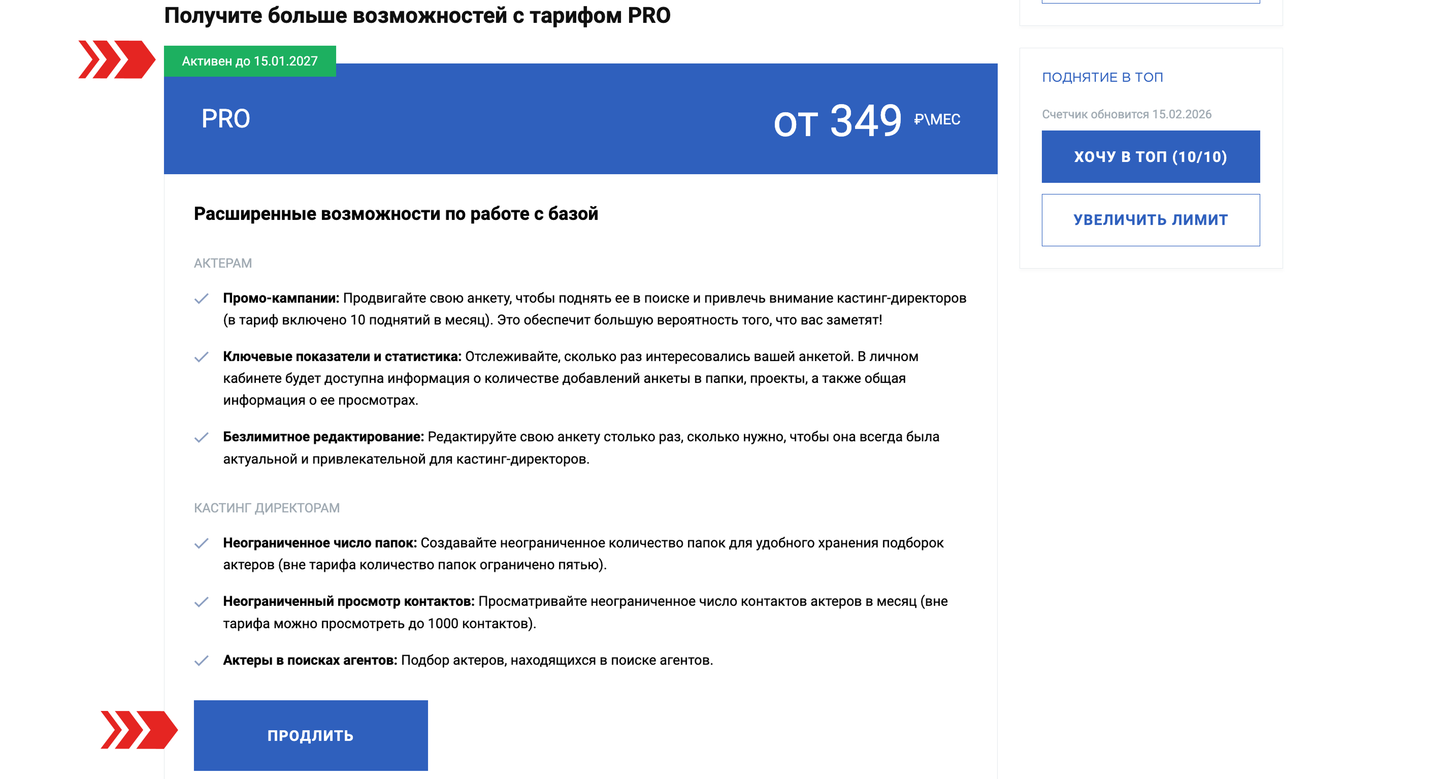 - Продвижение анкеты - позволяет поднять анкету в поиске и привлечь внимание кастинг-директоров (в тариф включено 10 поднятий в месяц).