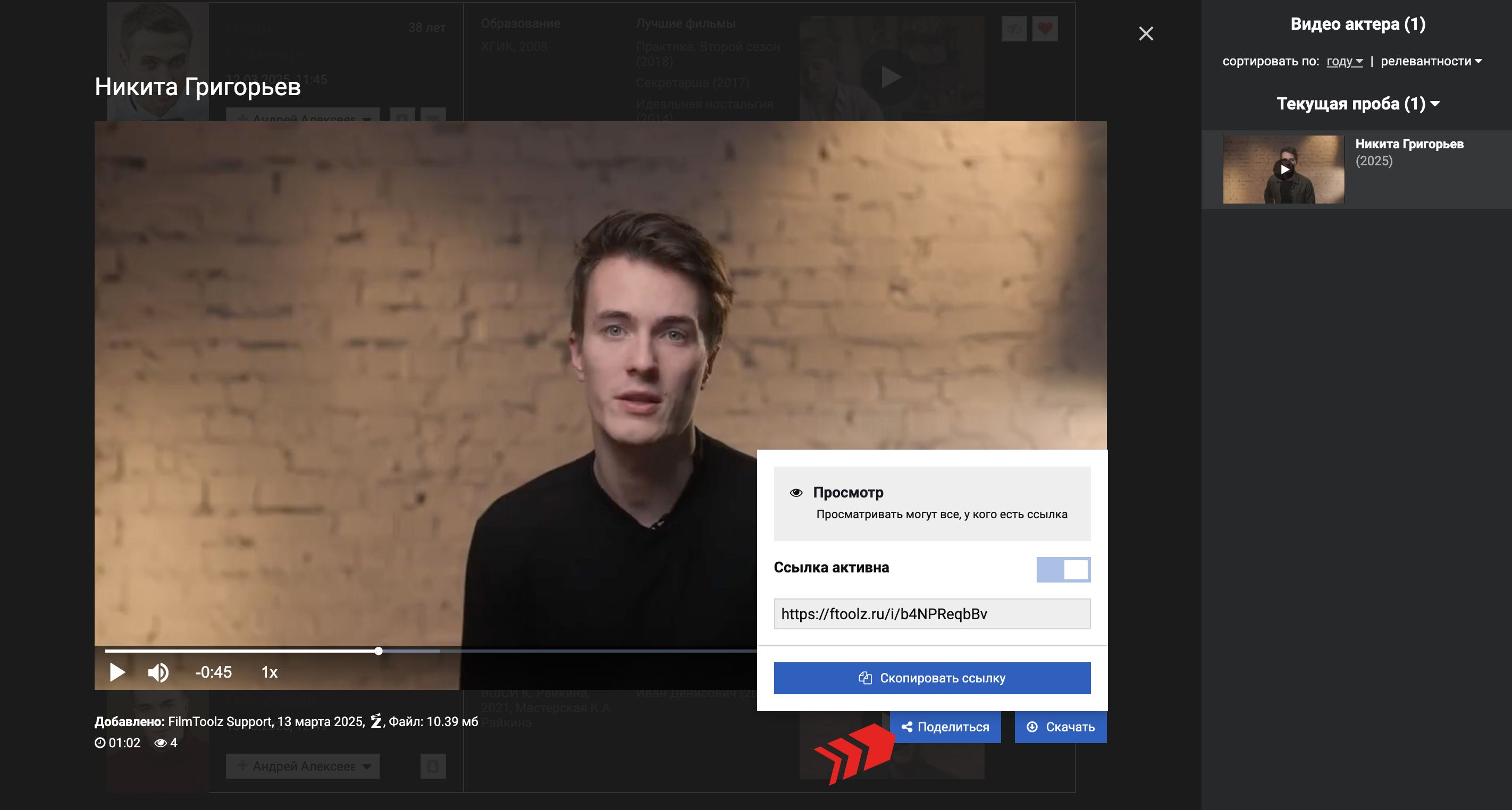 При желании, вы сразу можете поделиться пробой и отправить её режиссеру или любому другому человеку, даже не зарегистрированному в FiimToolz. Для этого нажмите "Поделиться", скопируйте ссылку и отправьте её.  По данной ссылке будет открываться отдельная страница только с этим видео, никакие другие данные из вашего личного кабинета видны не будут.