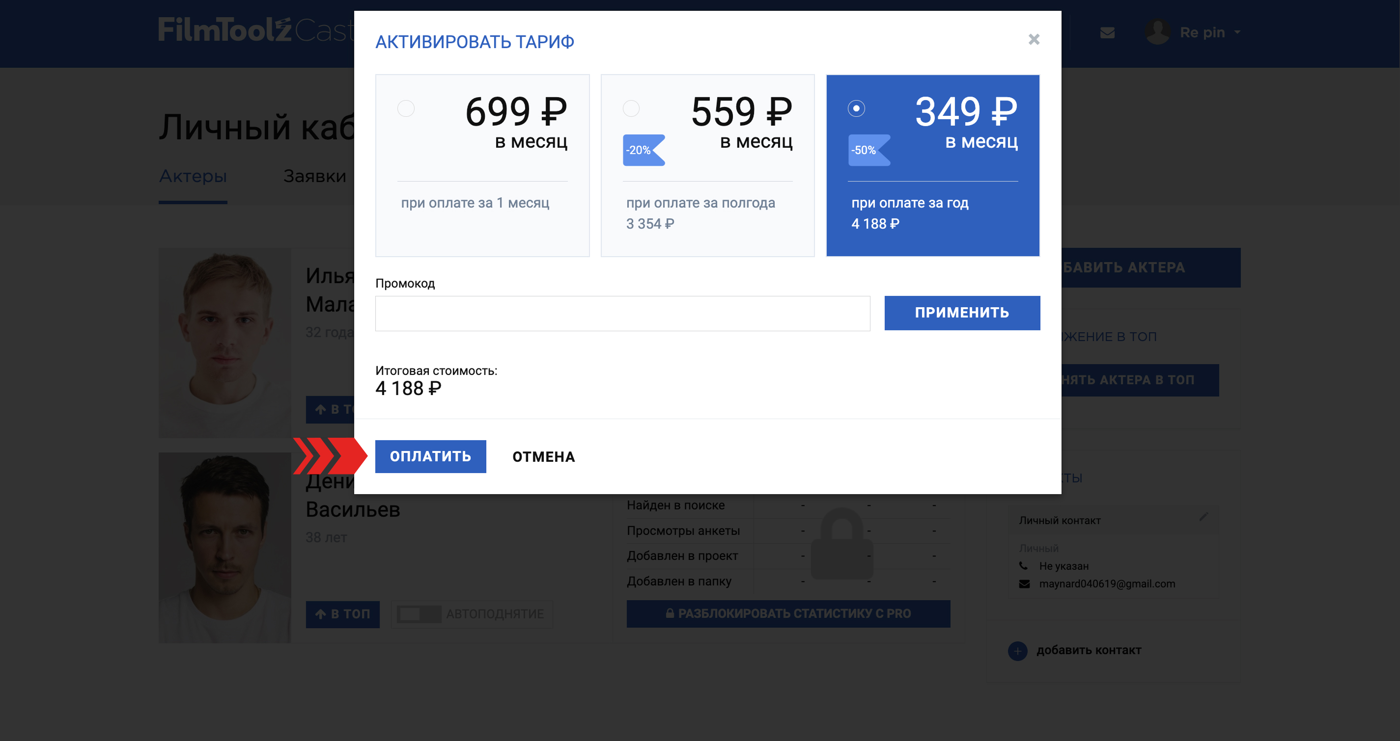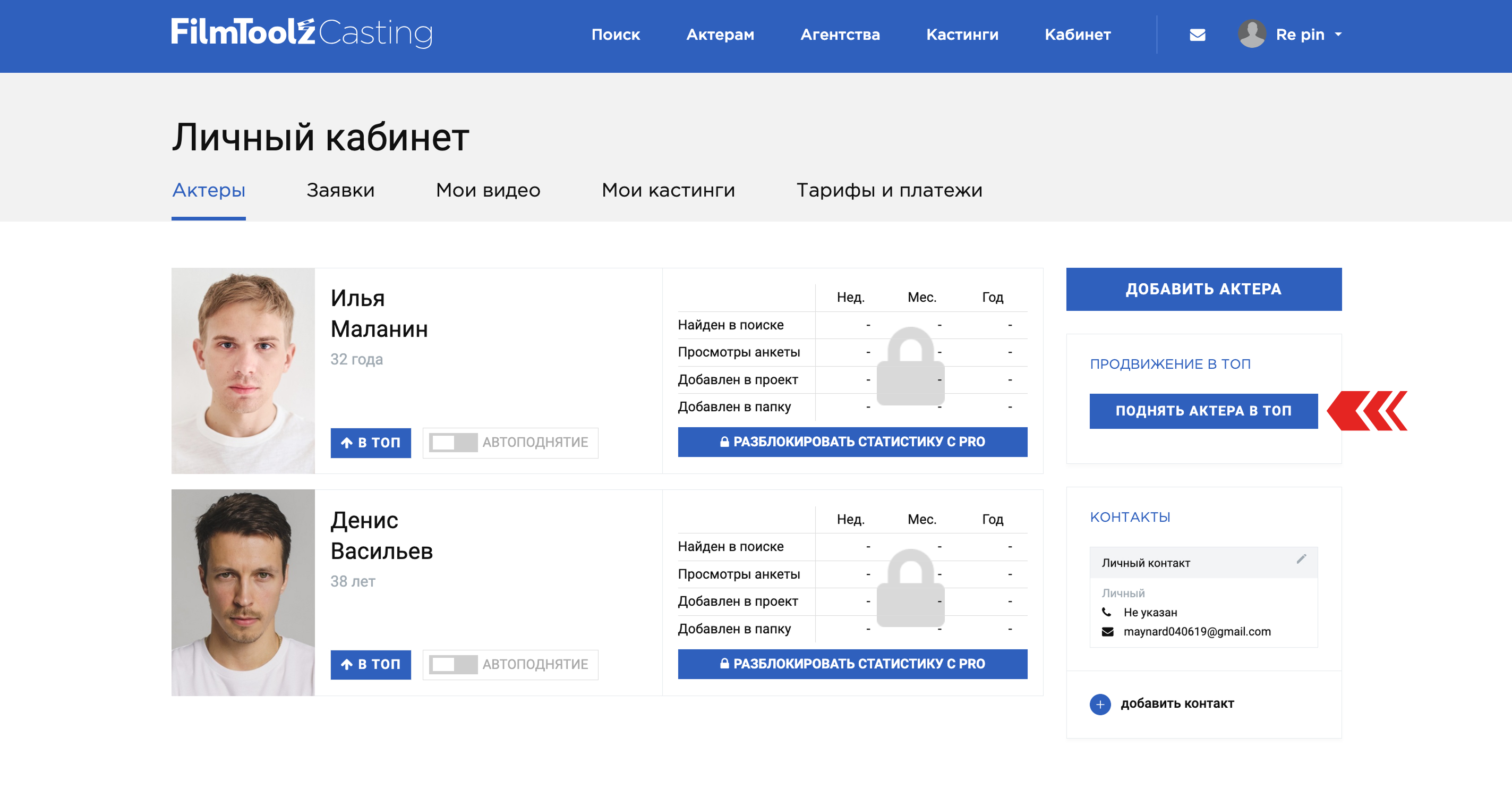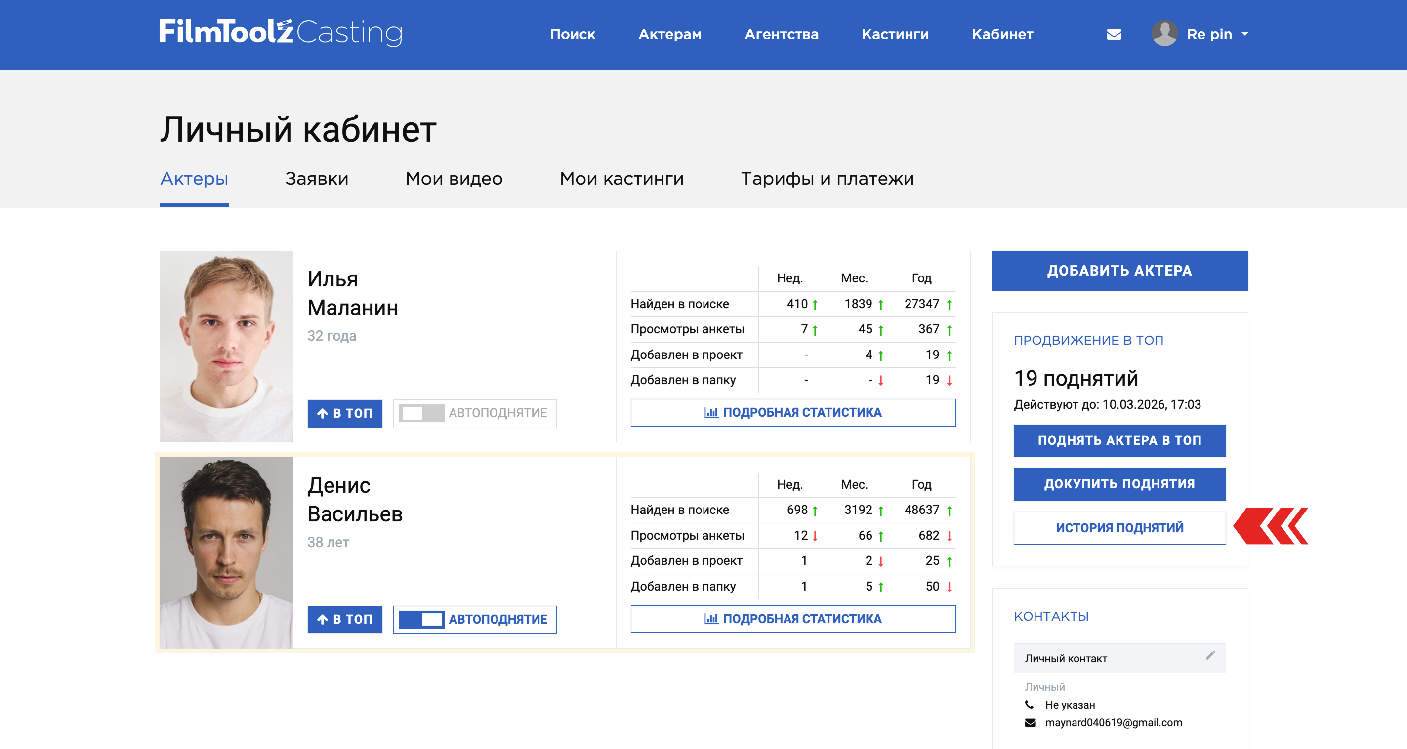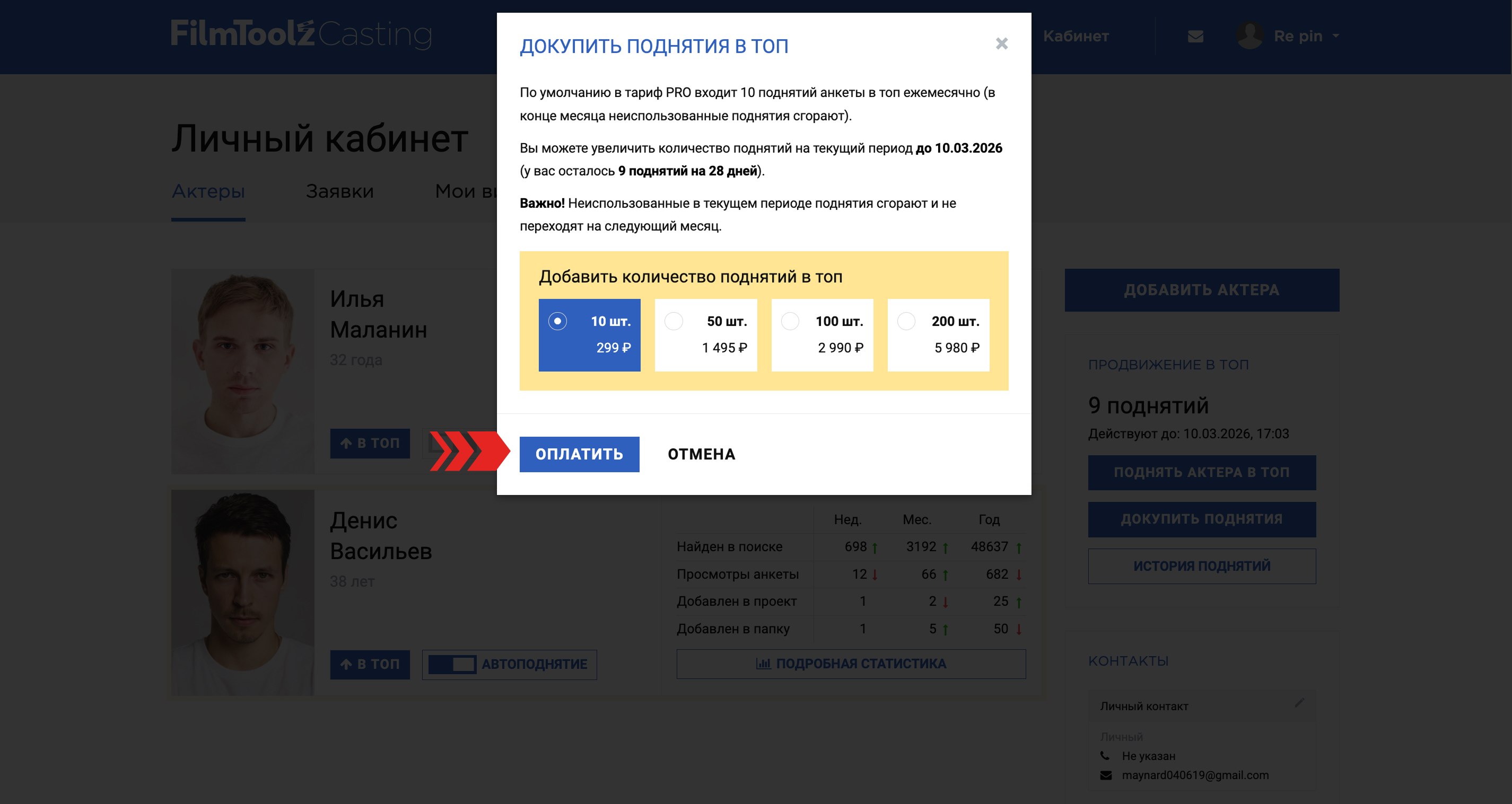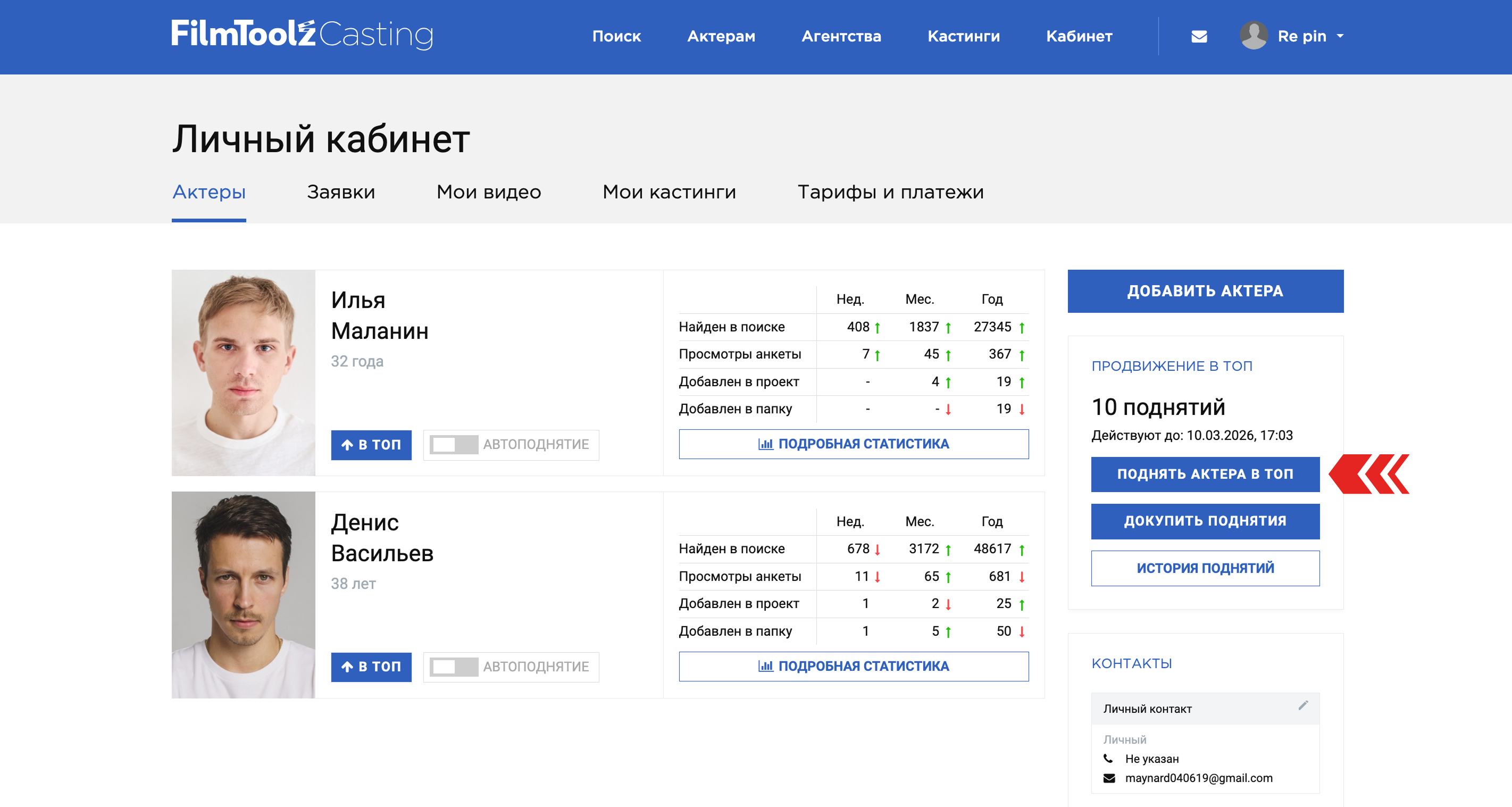 ВАЖНО! После оплаты тарифа, поднятие не происходит автоматически, для каждого поднятия необходимо нажимать кнопку "Поднять актера в топ".