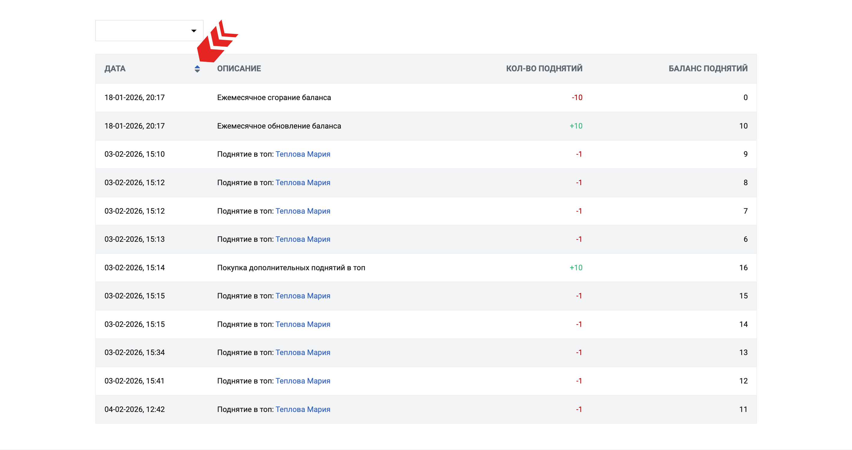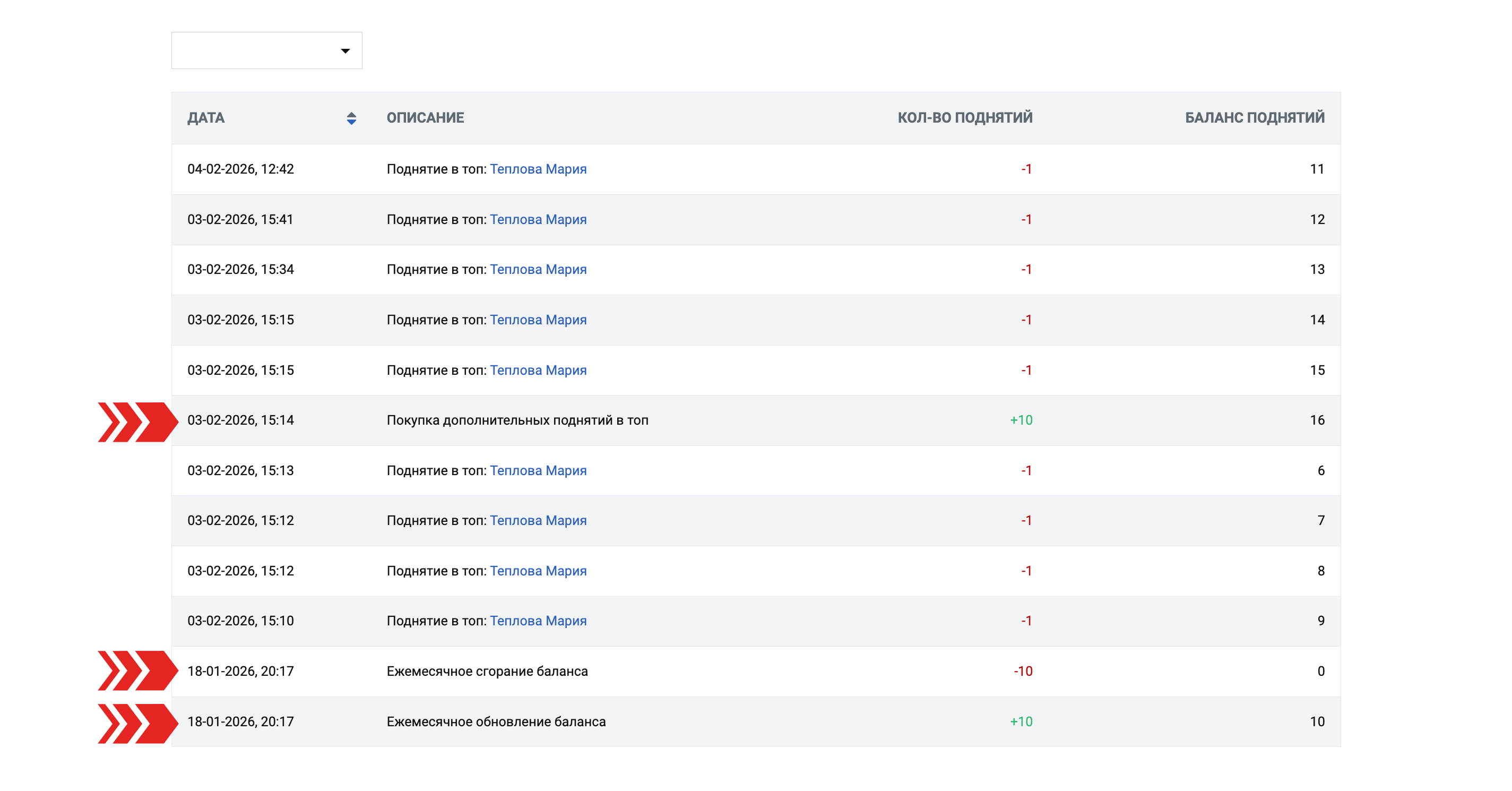 На странице «История поднятий» помимо времени фактического поднятия анкеты вы также можете посмотреть дополнительную информацию об изменении баланса показов, в том числе о: