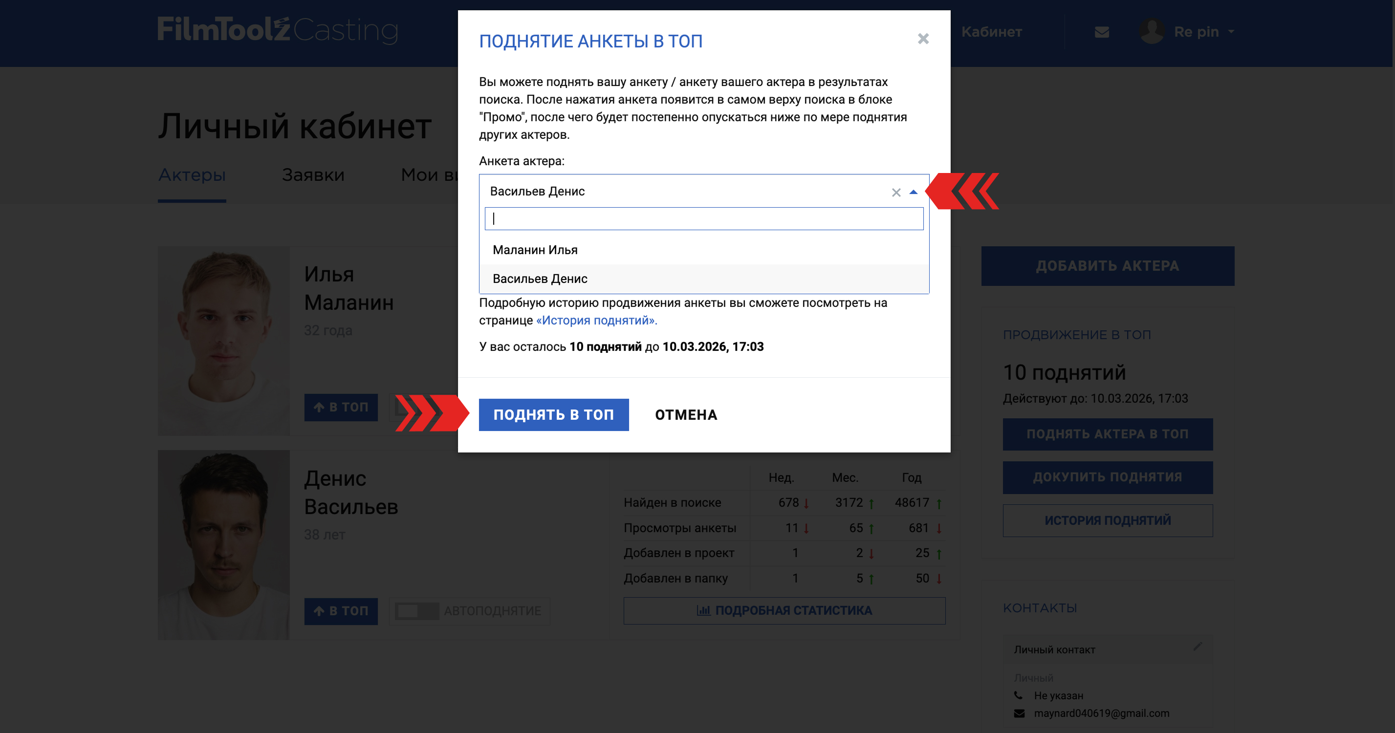 Если вы агент и у вас несколько актеров, то в выпадающем списке выберите того, кого именно вы хотите поднять в топ. В рамках тарифа Pro вы можете поднять суммарно 10 раз в месяц любые анкеты своих актеров (условно, либо 10 раз одного, либо 10 актеров по 1 разу).