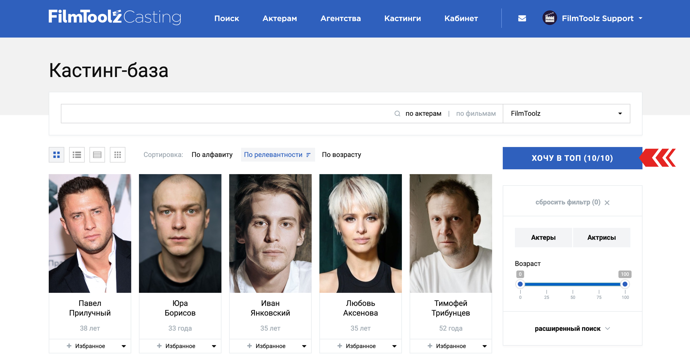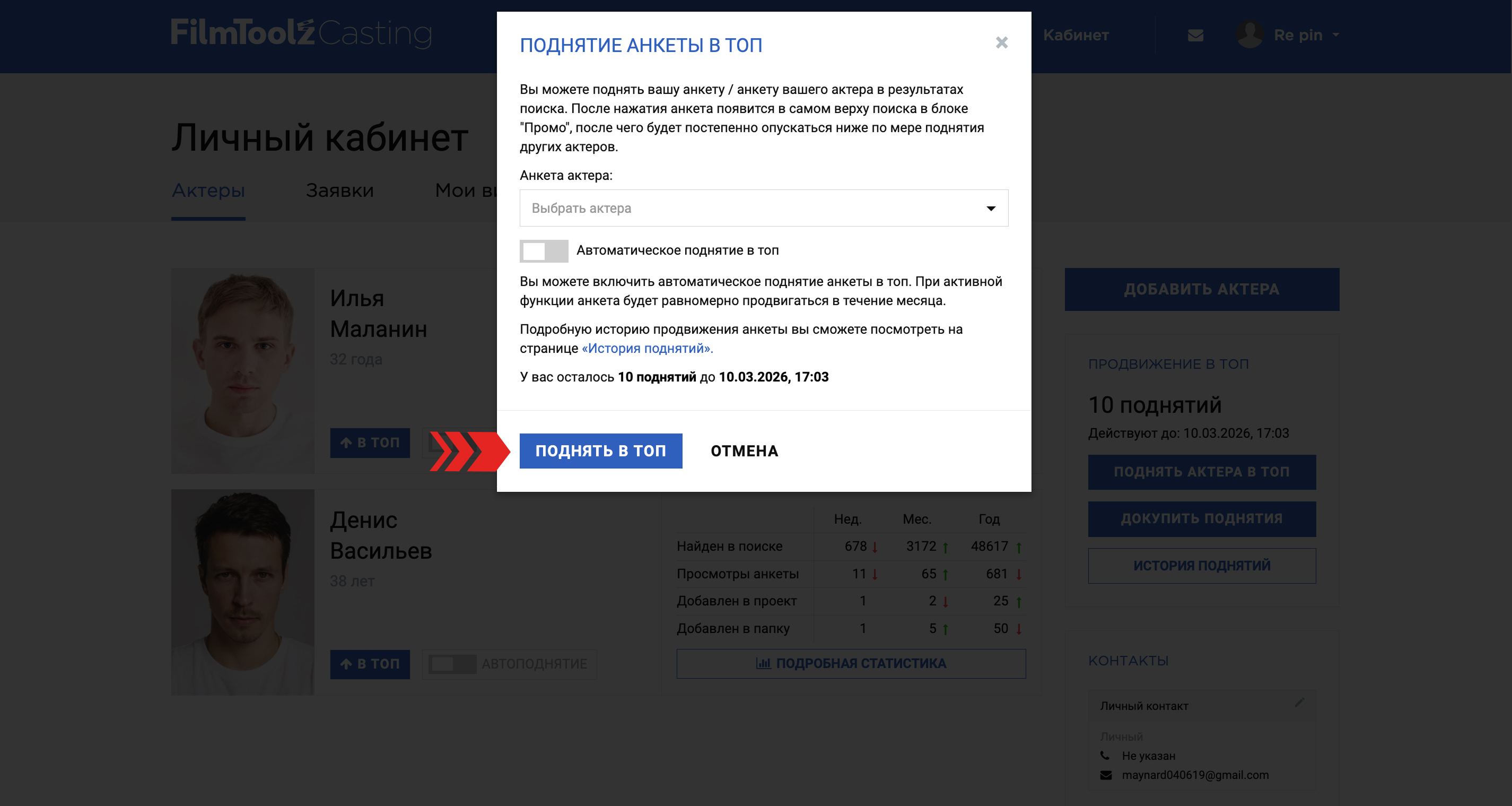 В открывшемся окне выберите актера (если вы агент) и нажмите “Поднять в топ”.