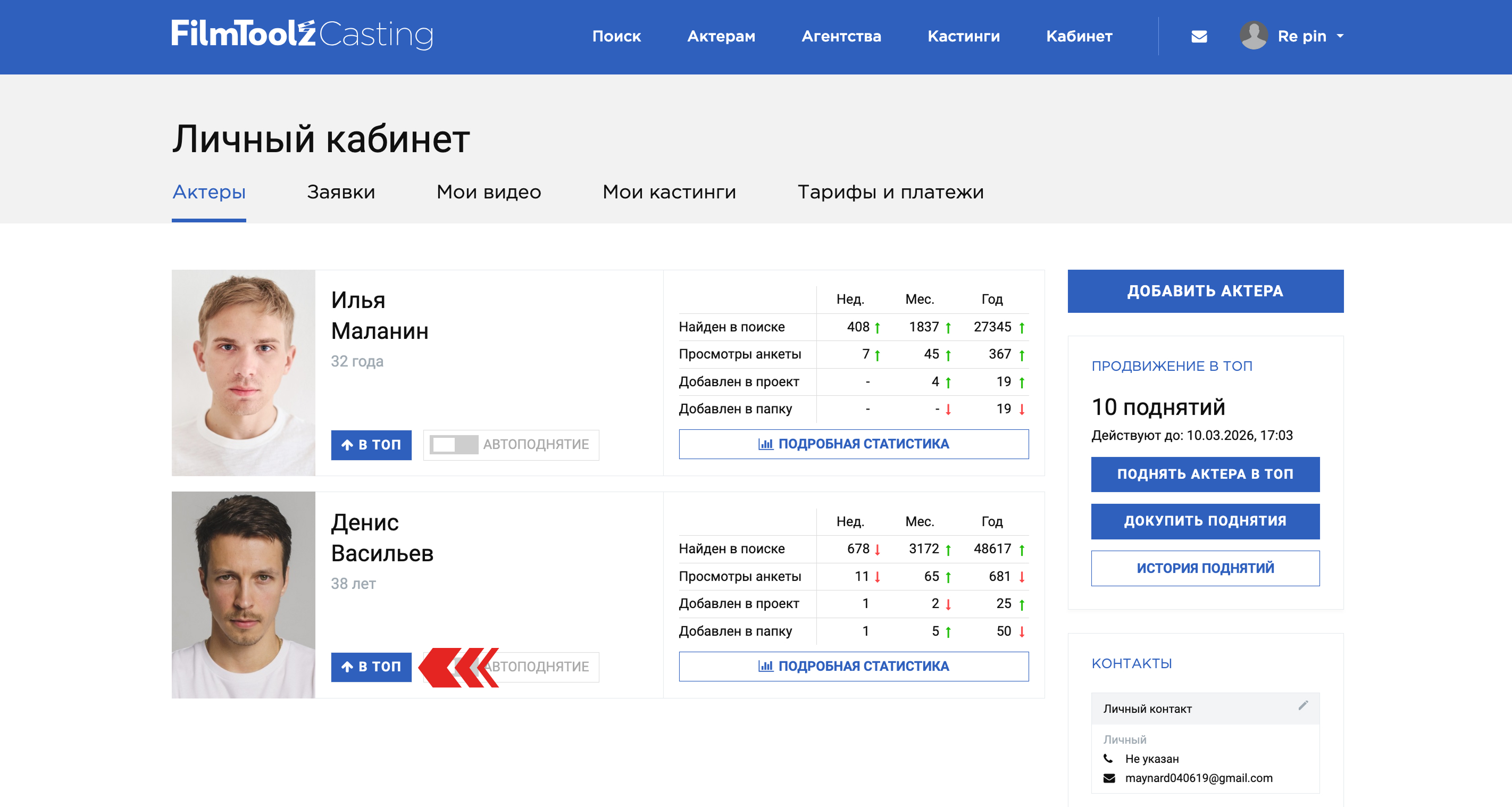 Если у вас несколько актеров, вы можете выбрать нужного и просматривать данные только по продвижению его анкеты.