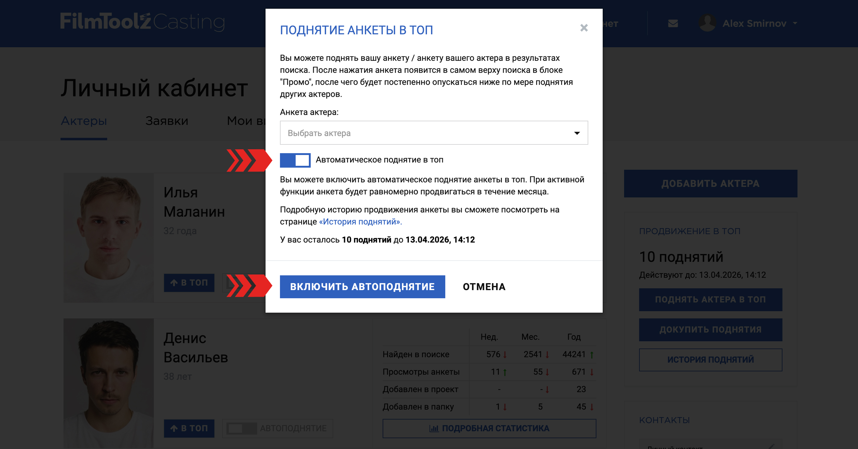 Агентам доступна возможность активации “автоподнятий” сразу для нескольких актеров - сделать это удобнее всего на странице списка актеров в личном кабинете.