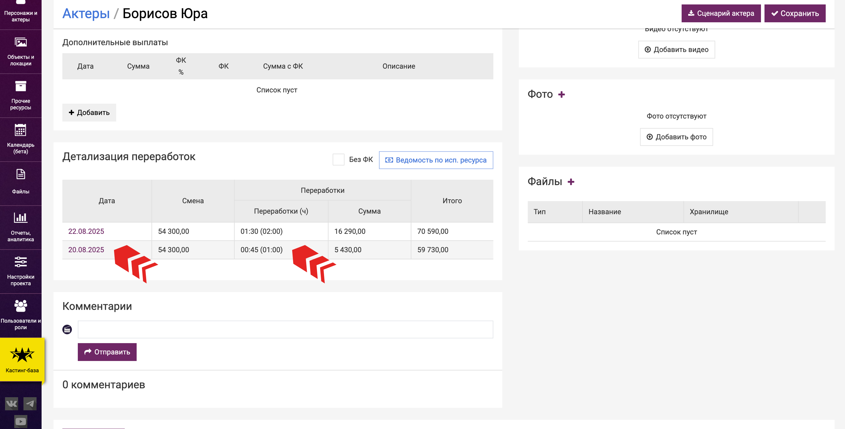 Для того, чтобы осуществить расчёт, необходимо заполнить базовую финансовую информацию на странице нужного актера/ресурса, а также - производственную отчетность (часы работы) по завершенным сменам. Рассмотрим на примере актёра.