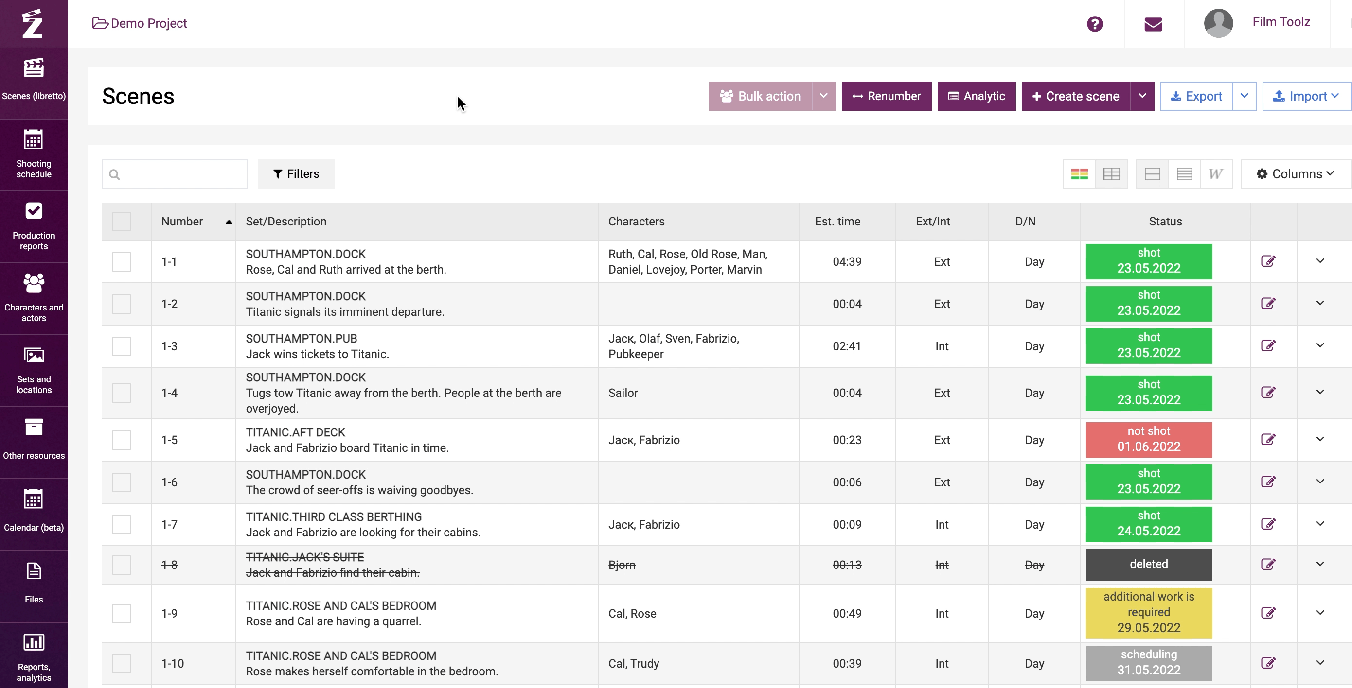 FilmToolz makes it possible to change multiple scenes simultaneously as a group: you can delete, mark for deletion, remove the mark for deletion, or change a set, script day, and day time, as well as add or delete characters and elements of the scenes.