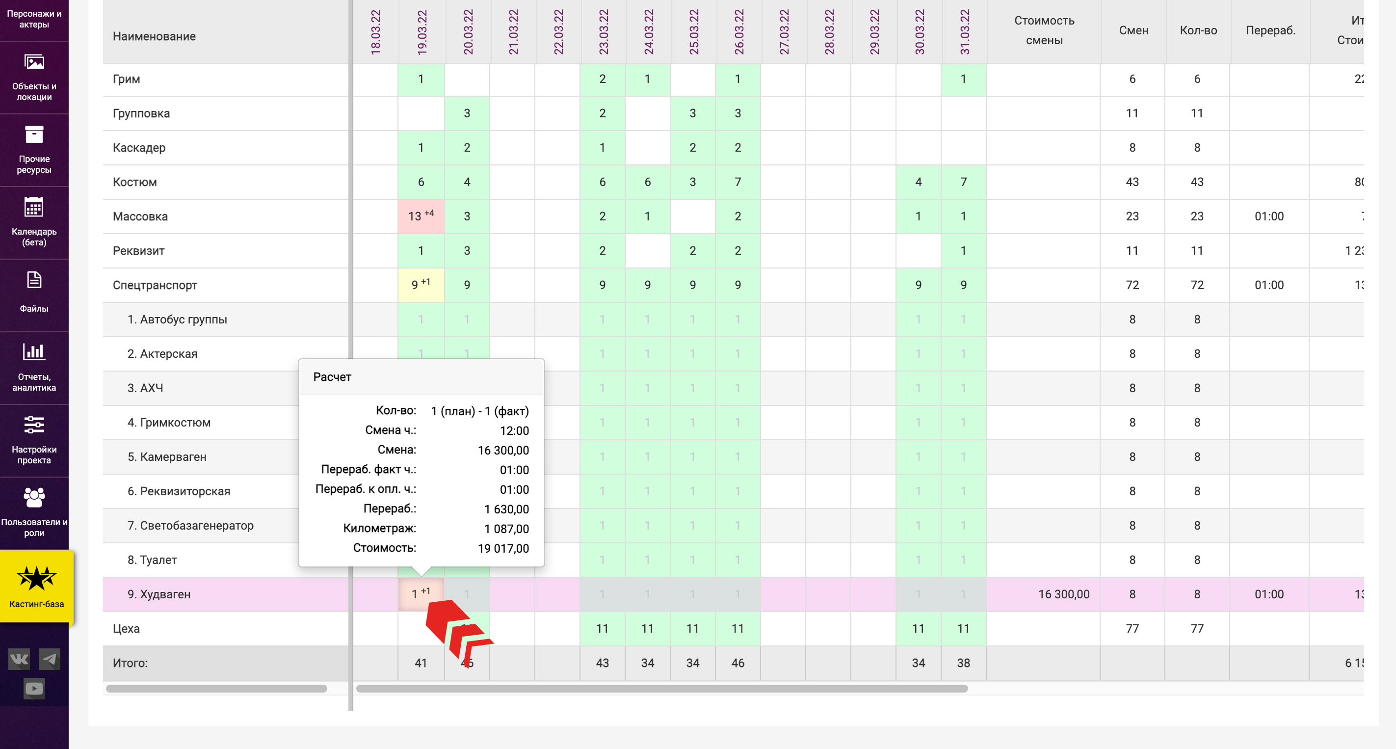 Если факт прошедшей съемки не введен, то система при подсчете стоимости будет учитывать только плановые показатели без расчета переработок. Если на странице ресурса не указана продолжительность смены, по умолчанию система будет учитывать двенадцатичасовой рабочий день. При наведении курсора на ячейку система подскажет вам плановое и фактическое количество данного ресурса на день, количество часов переработки и её стоимость, а также стоимость километража.