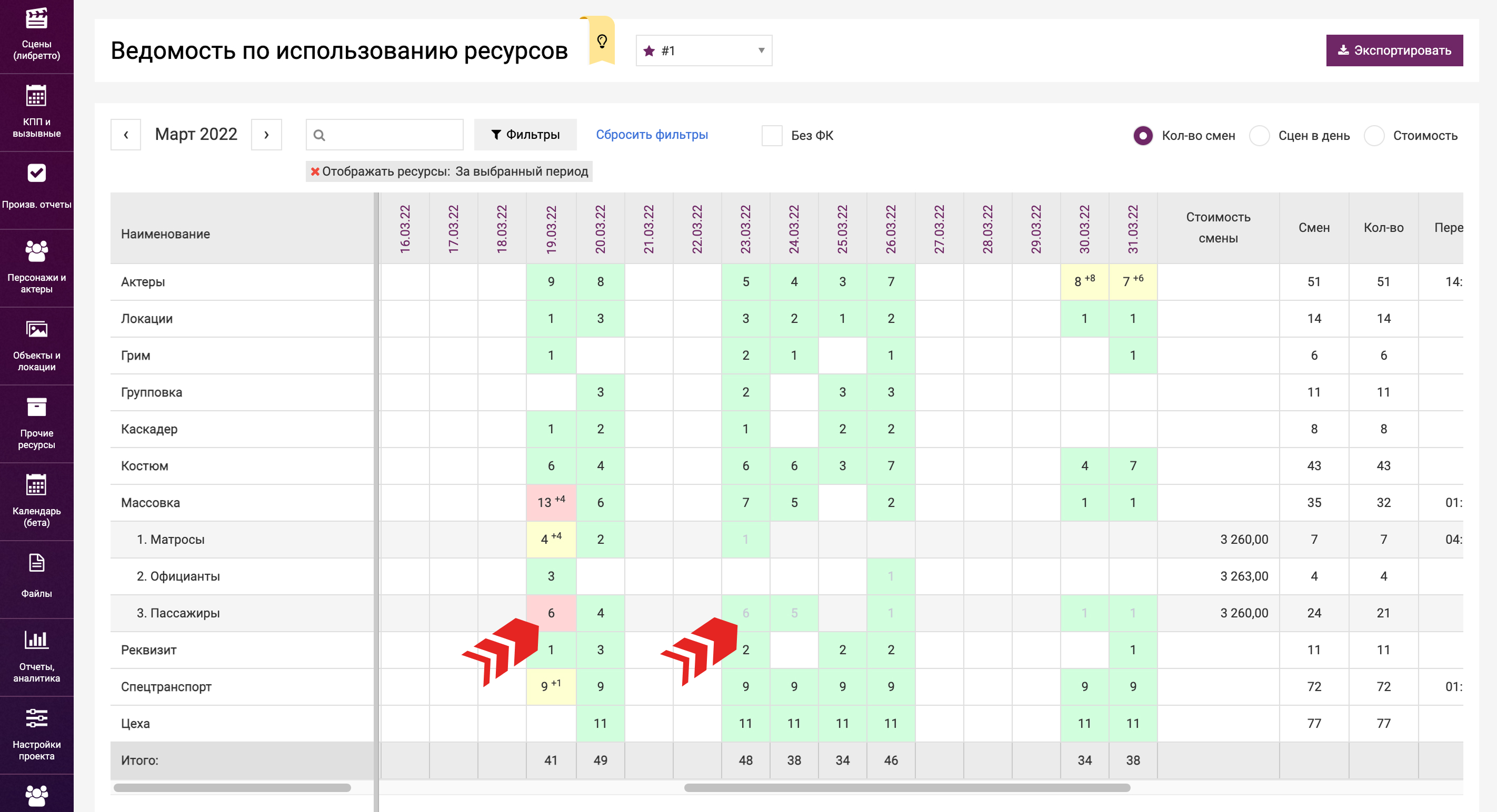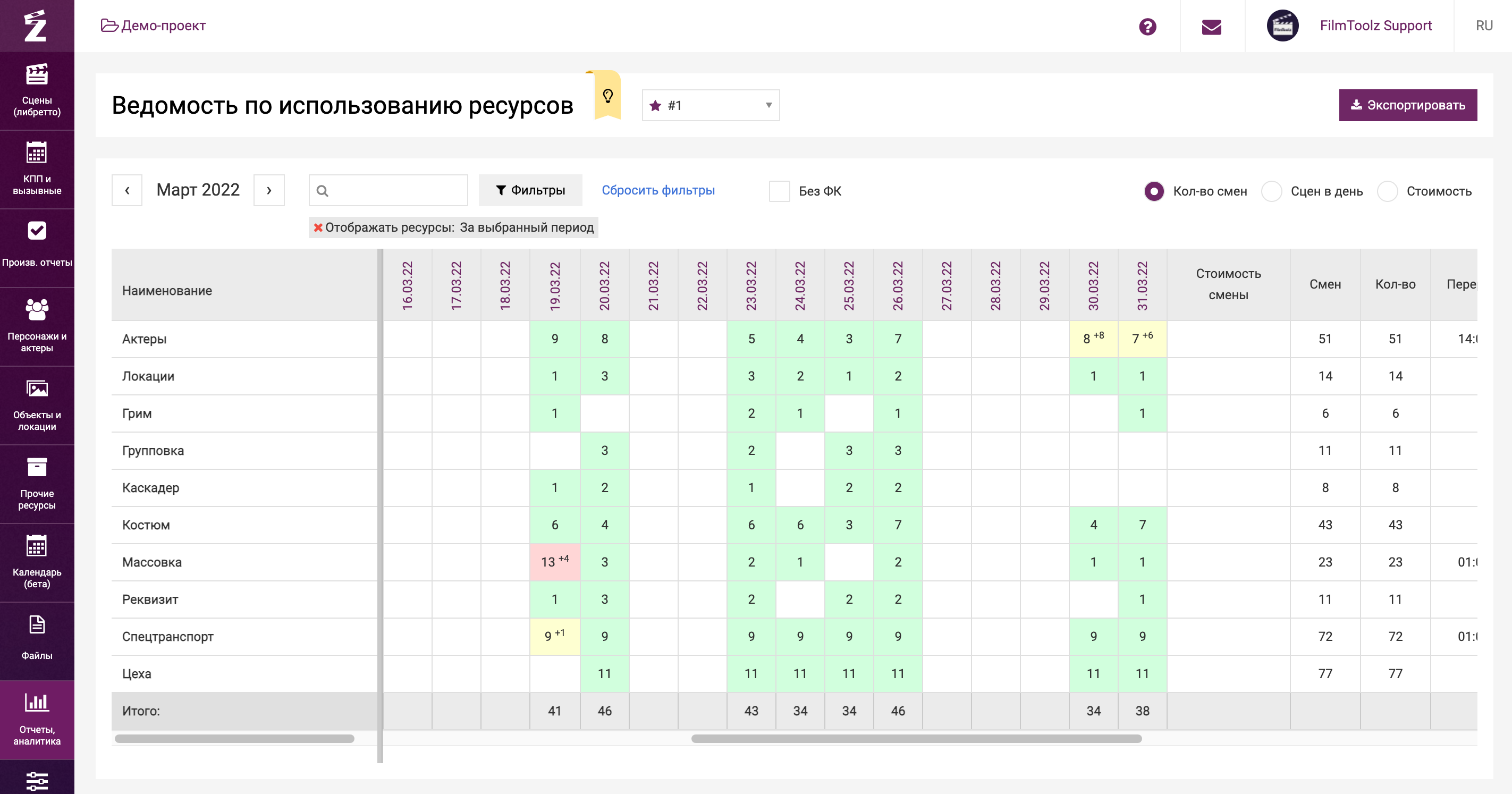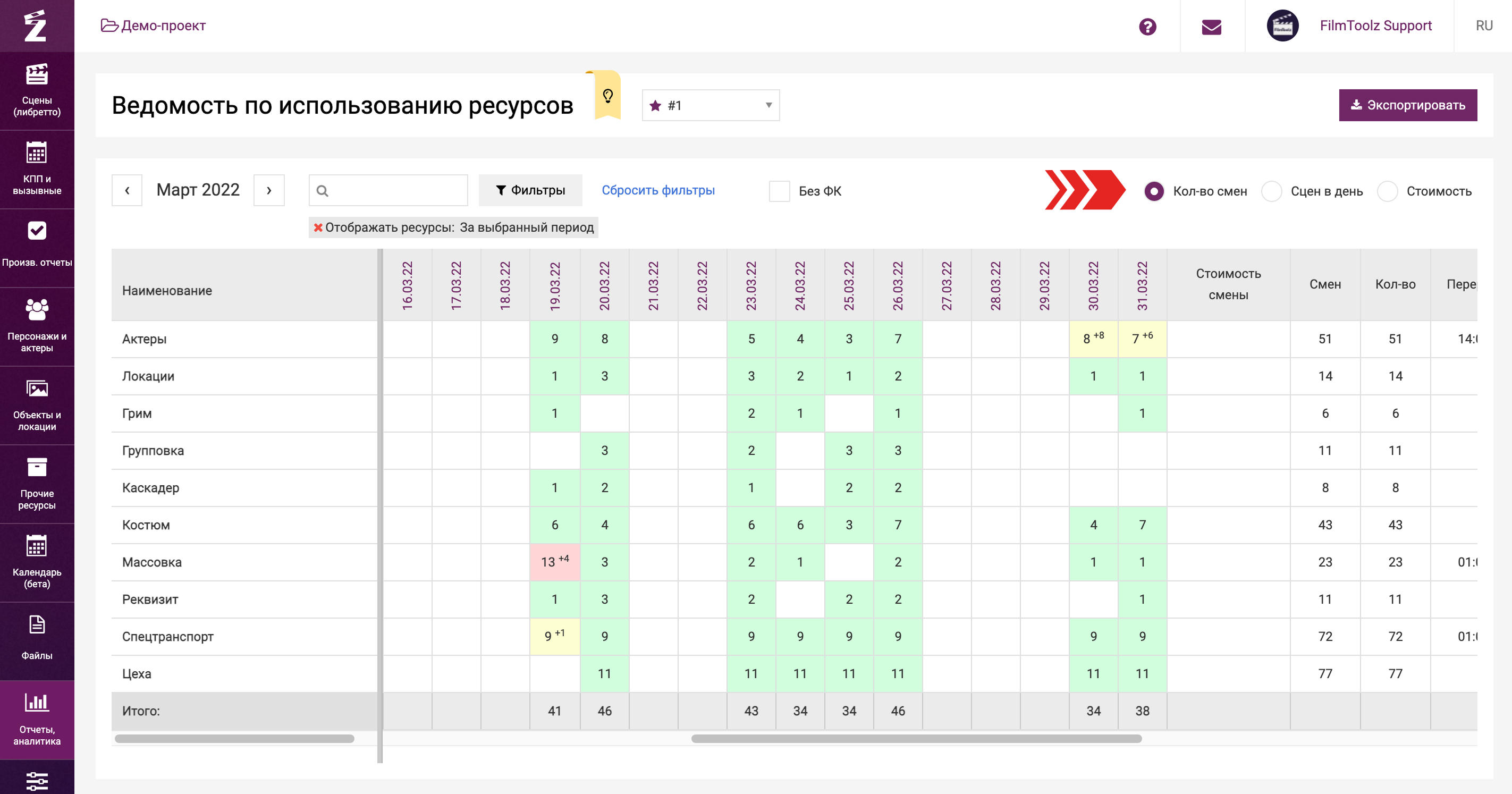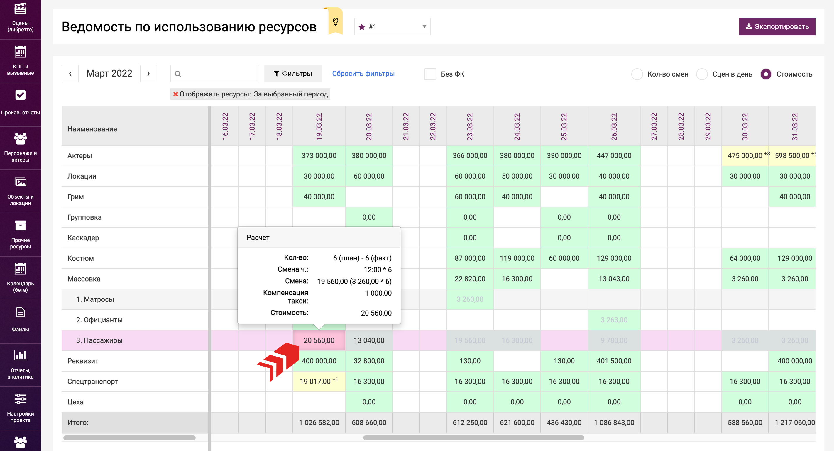 Чтобы получить подробную аналитику о количестве используемых актеров, локаций и ресурсов, их стоимости и переработках за период, воспользуйтесь «Ведомостью по использованию ресурсов». Данный отчет вы можете найти в меню «Отчеты и аналитика».