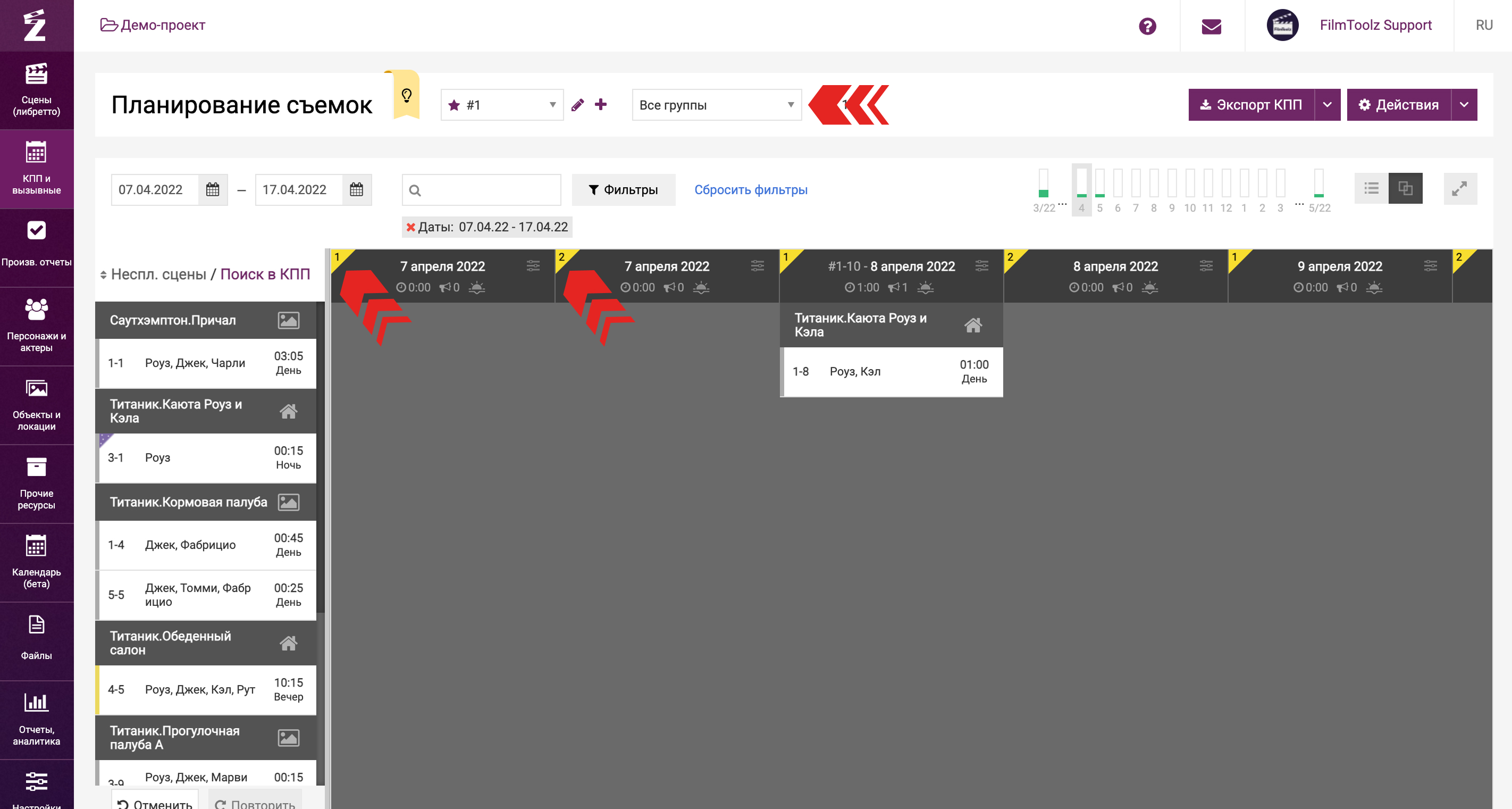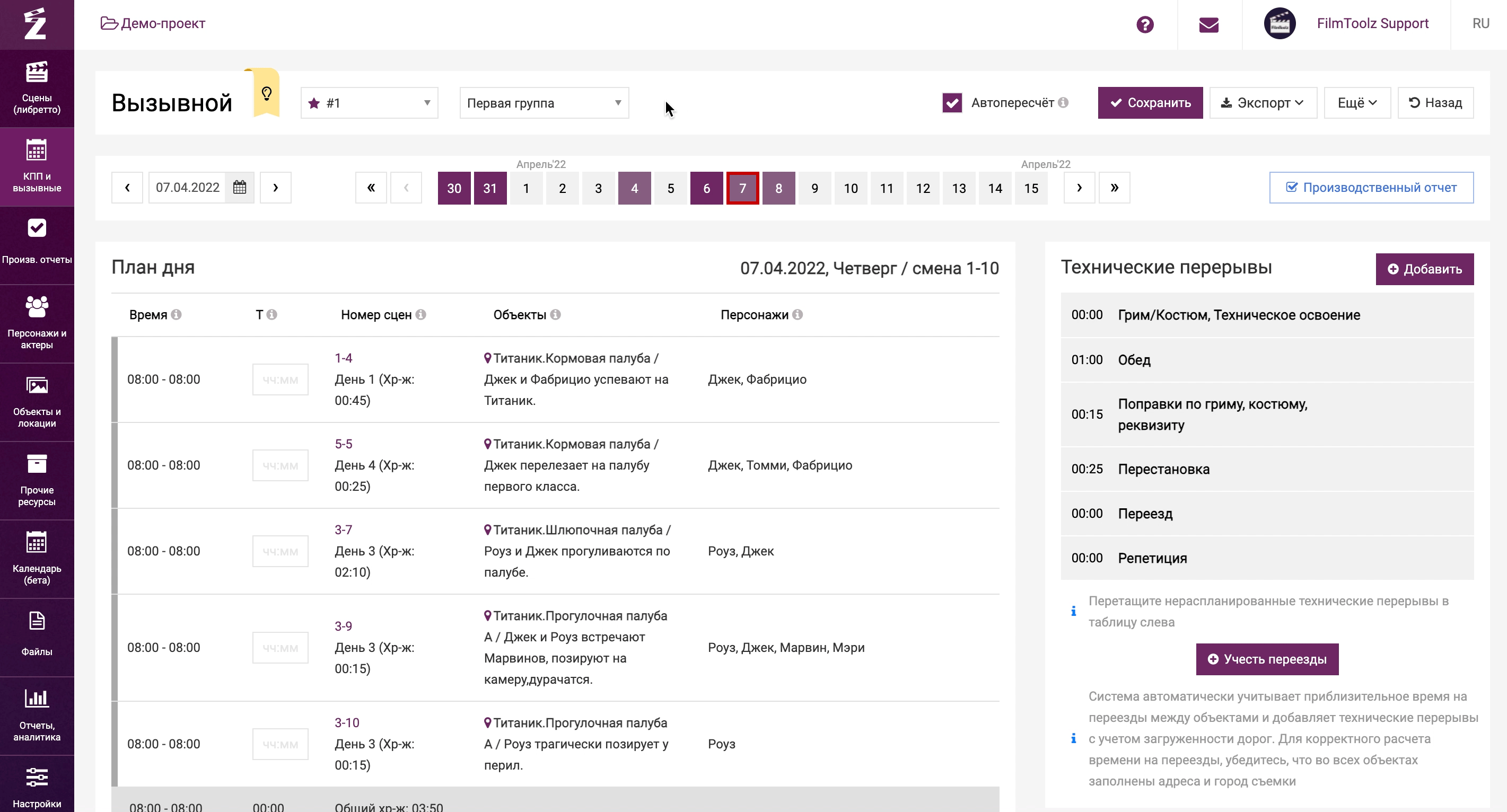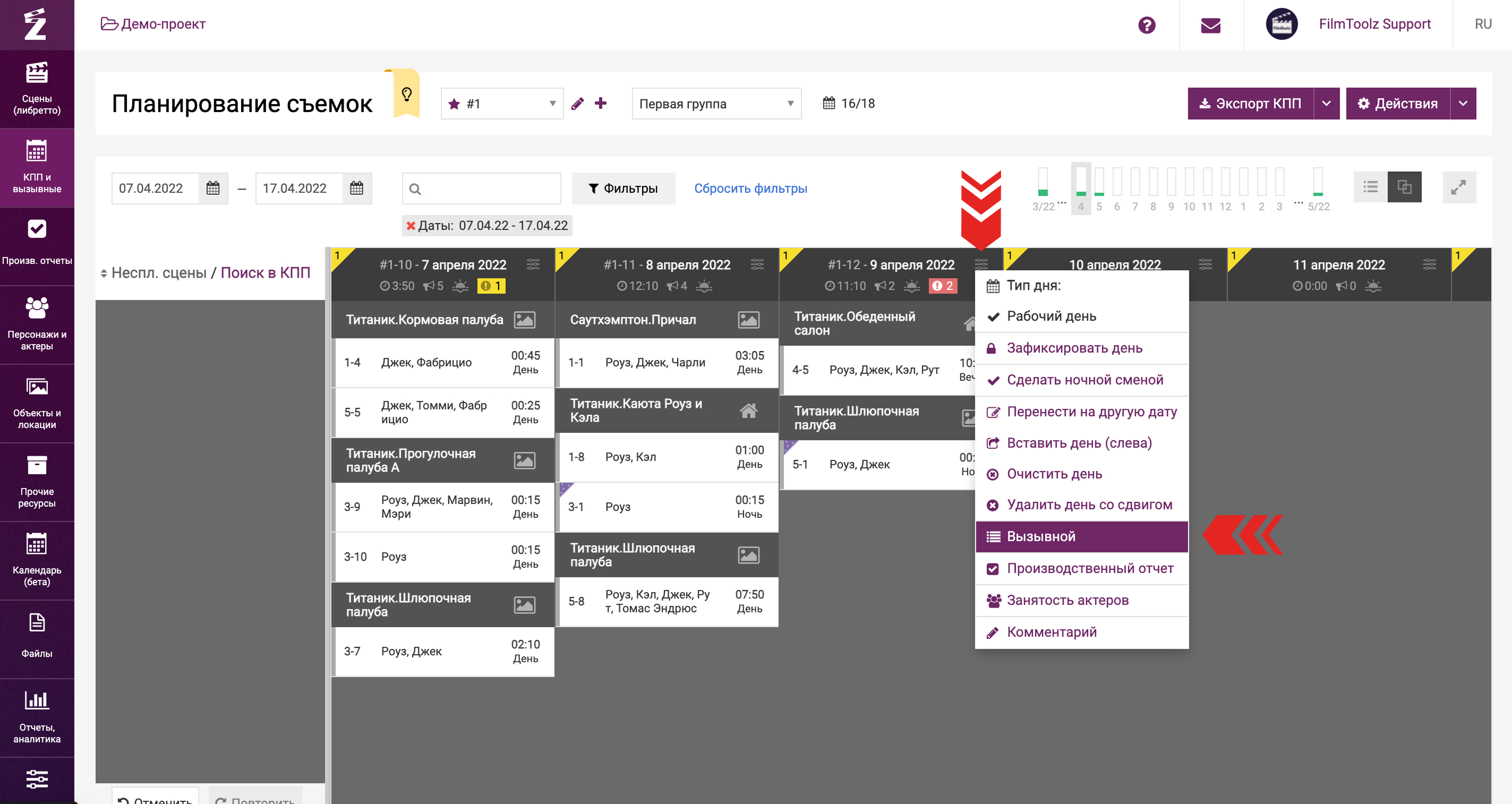 Продолжить планирование и составить вызывной для каждой из съемочных групп вы сможете, перейдя в пункт «Вызывной».