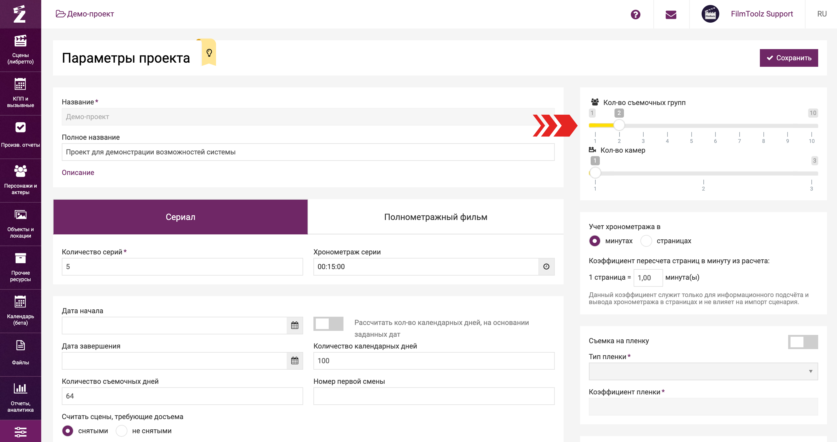 FilmToolz позволяет осуществлять планирование КПП , вызывных, а также формировать производственную отчетность в разрезе одной или нескольких съемочных групп. В настройках проекта вы можете указать необходимое для работы количество съемочных групп.