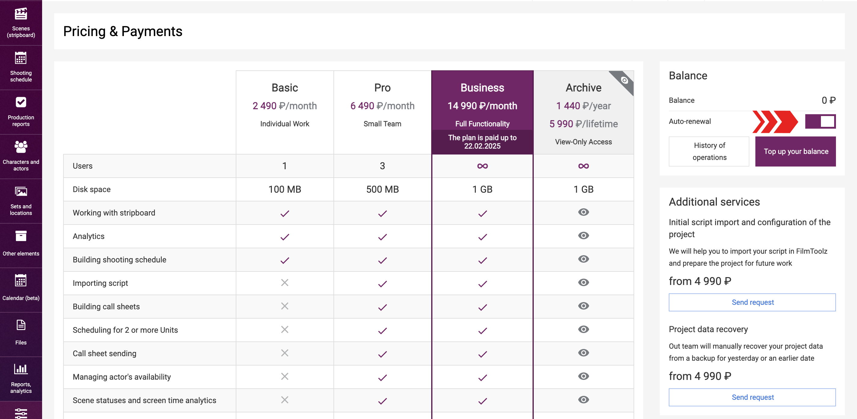 Upon creation of a new project, the system will assign the “Basis” subscription plan for it by default and provide the user with a 7-day free period to set to work. During the free period, you may select one of the subscription plans available in the system and make the payment. Otherwise, the project will be disabled upon expiry of this period.