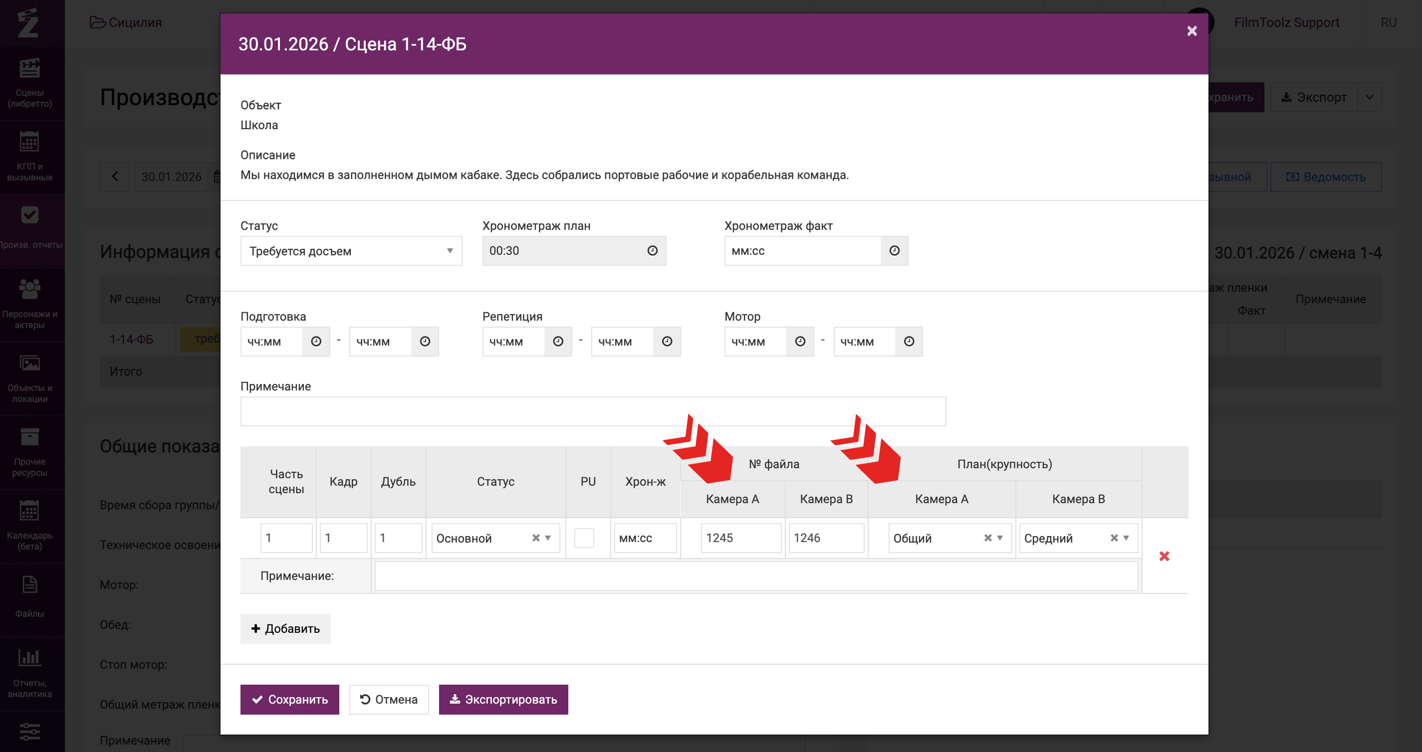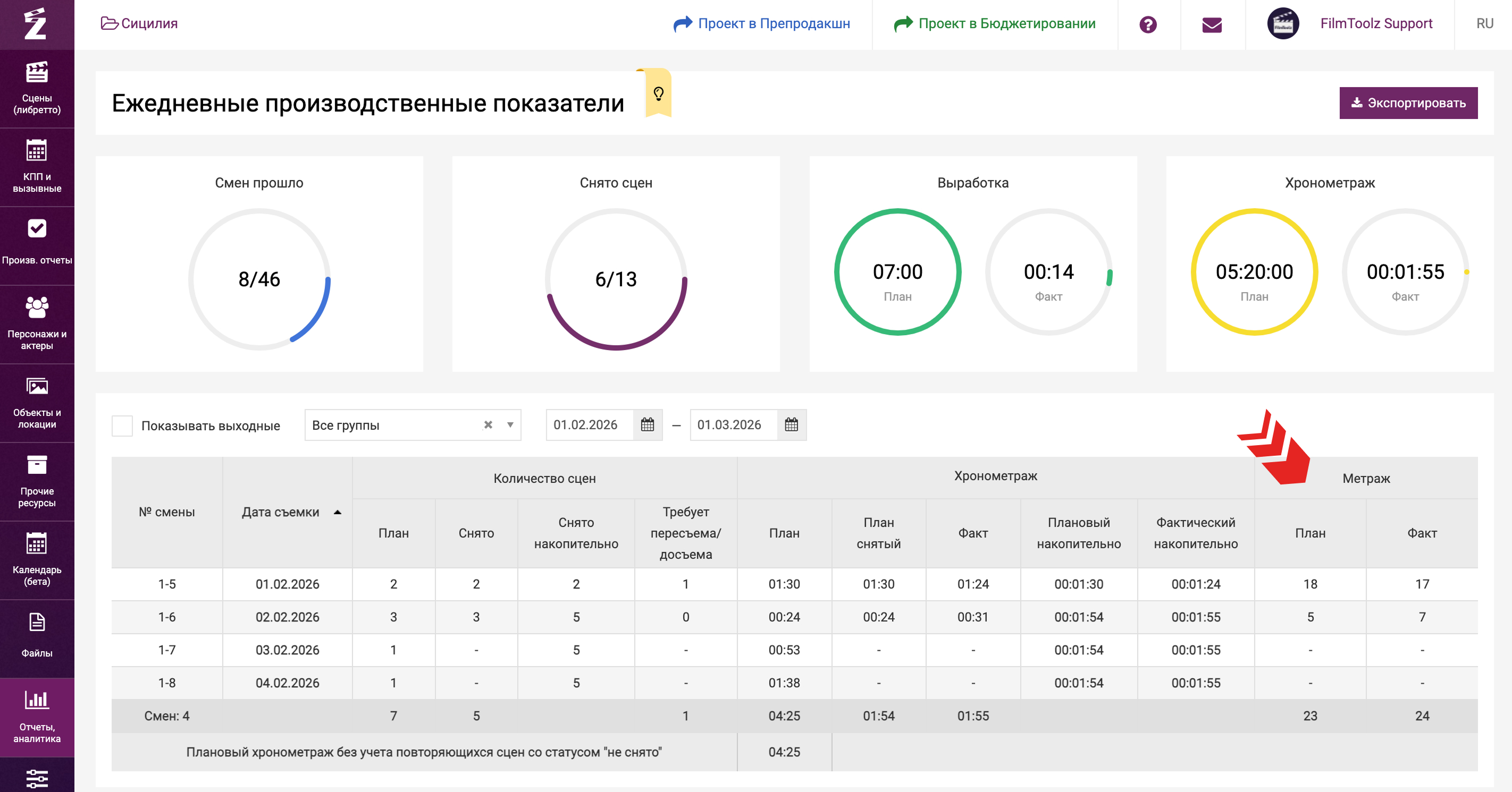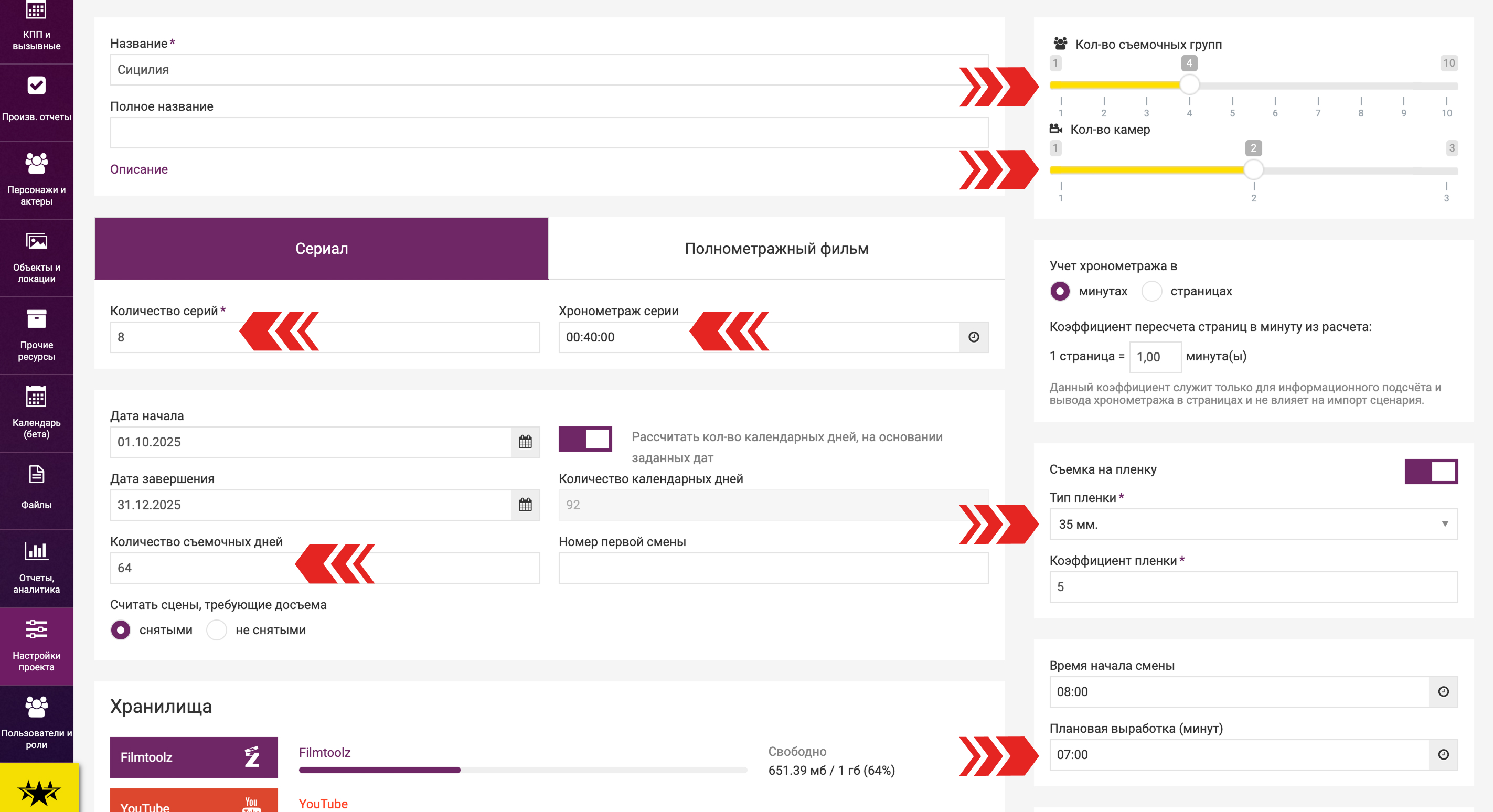 Если ваш проект снимается на пленку, отметьте это в настройках и укажите тип пленки, на который будет производиться съемка. Это позволит системе автоматически конвертировать плановый и фактический хронометраж из минут в метры и включать данный показатель в отчеты.