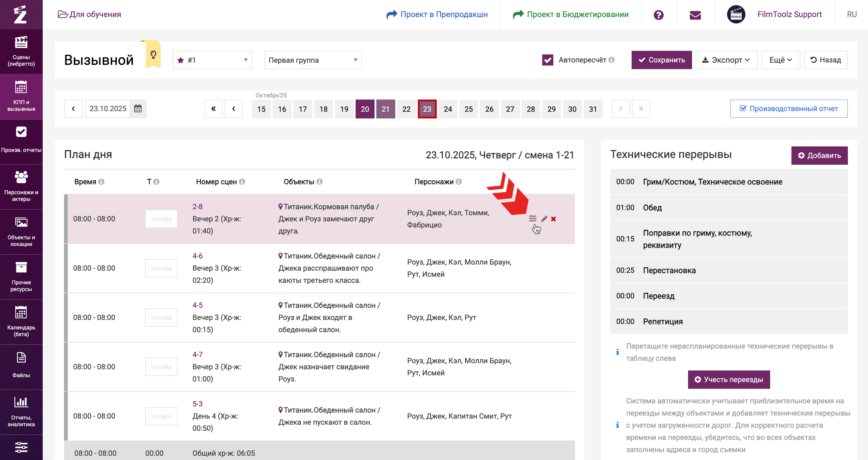 Изменение планового хронометража в атрибутах досъема отображается только в вызывном и производственном отчетах этой смены. Общий хронометраж сцены при этом не меняется и не суммируется с досъемом — во всех отчетах системы будет учитываться хронометраж изначальной сцены.