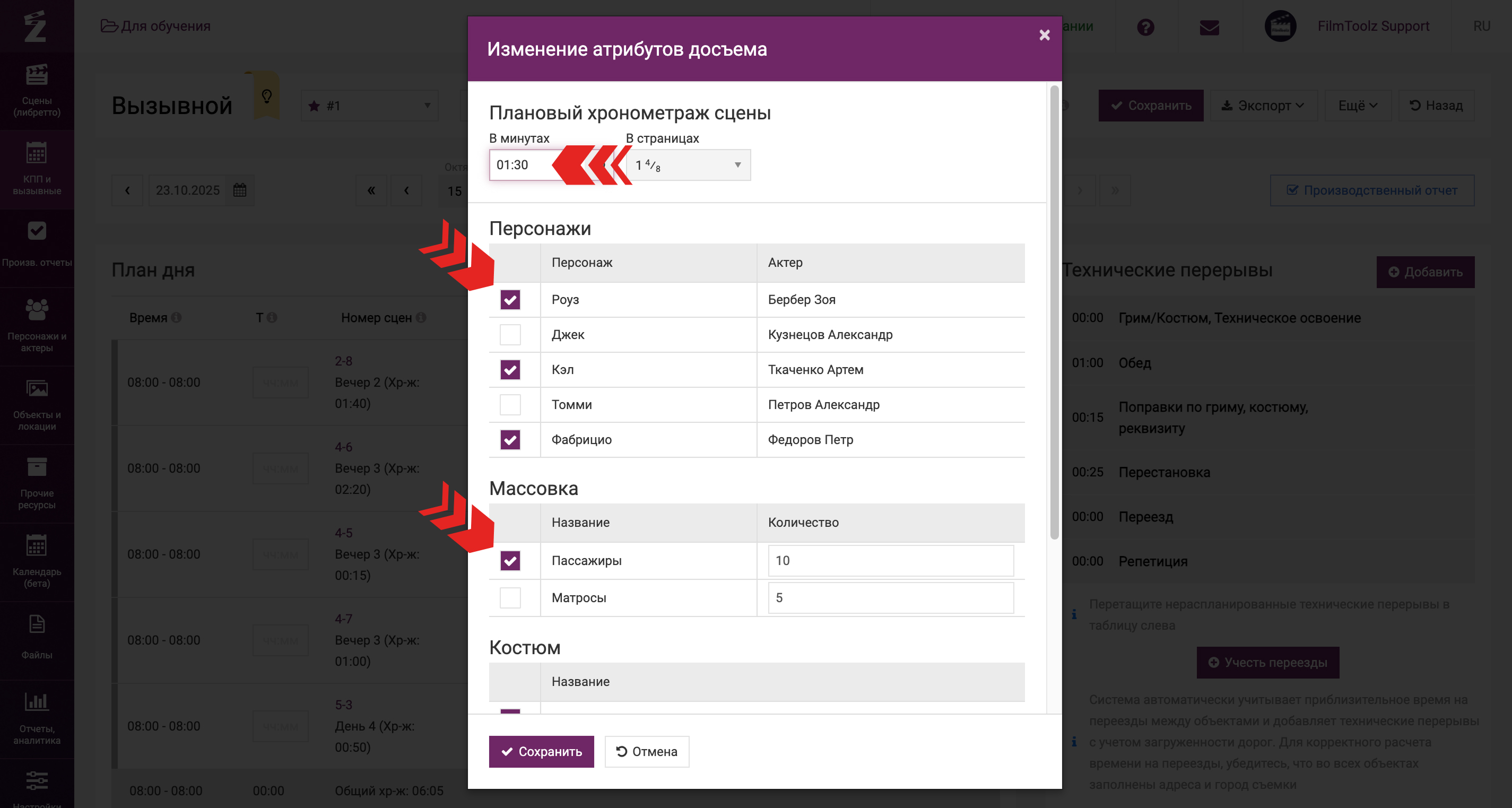 Кликнув на нее, вы можете отредактировать плановый хронометраж сцены, а также отметить, какие из ресурсов не будут задействованы в досъеме, сняв с них чекбоксы.