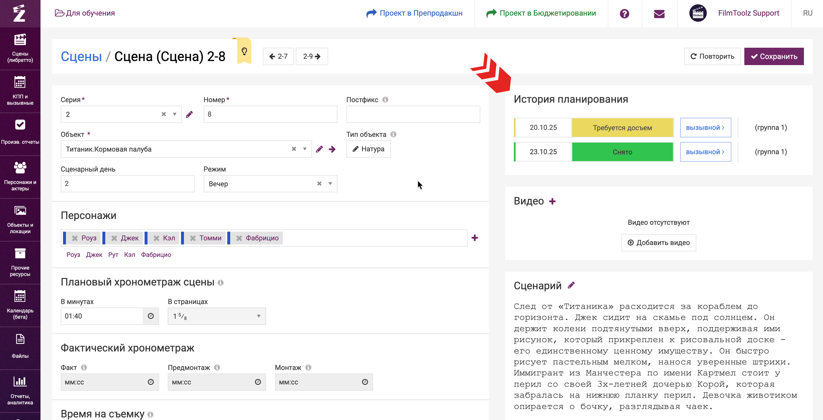 Таким образом, сцена может быть запланирована несколько раз на разные даты. Посмотреть всю историю планирования сцены, как и статусы в каждую смену, можно на её странице.