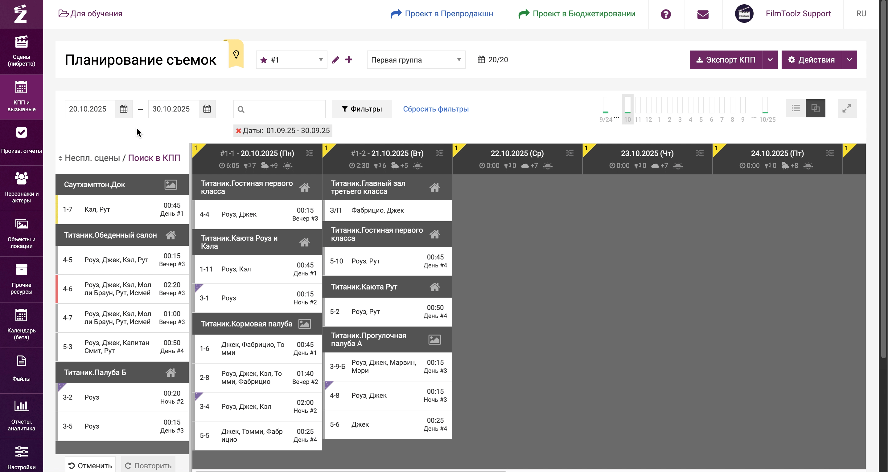 Если в производственном отчете вы ставите у сцены статус “Требуется досъем” или “Не снято”, то система создает дубль этой сцены и повторно размещает её в блоке неспланированных сцен в КПП, чтобы вы могли повторно спланировать её на новую дату. Такие сцены отображаются там с желтыми и красными пометками, а после того, как вы их спланируете, цвет поменяется на серый.