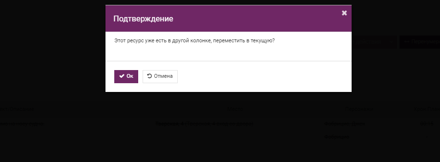 Если выбранный ресурс уже есть в каком-либо столбце, то об этом появится предупреждение.