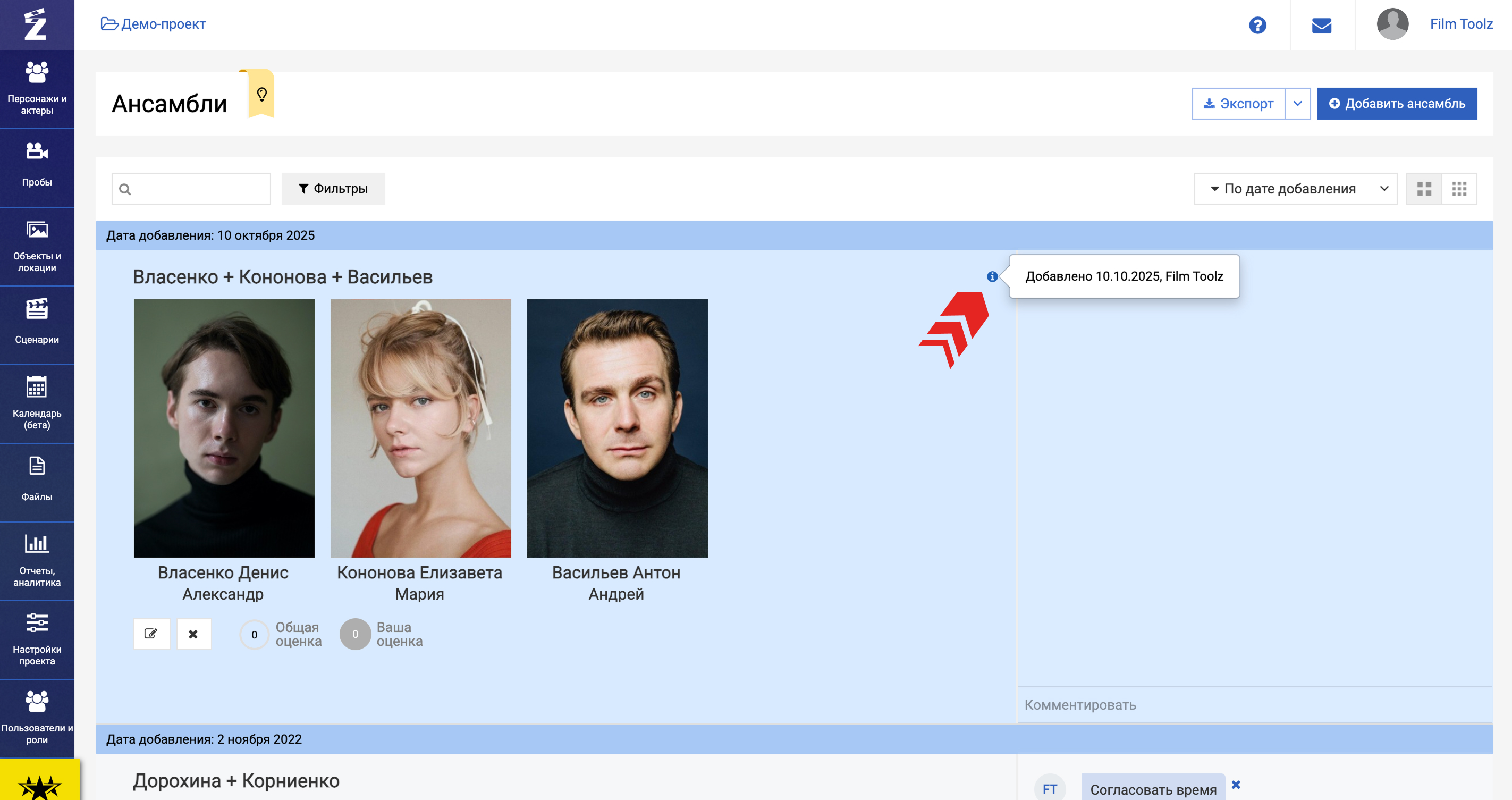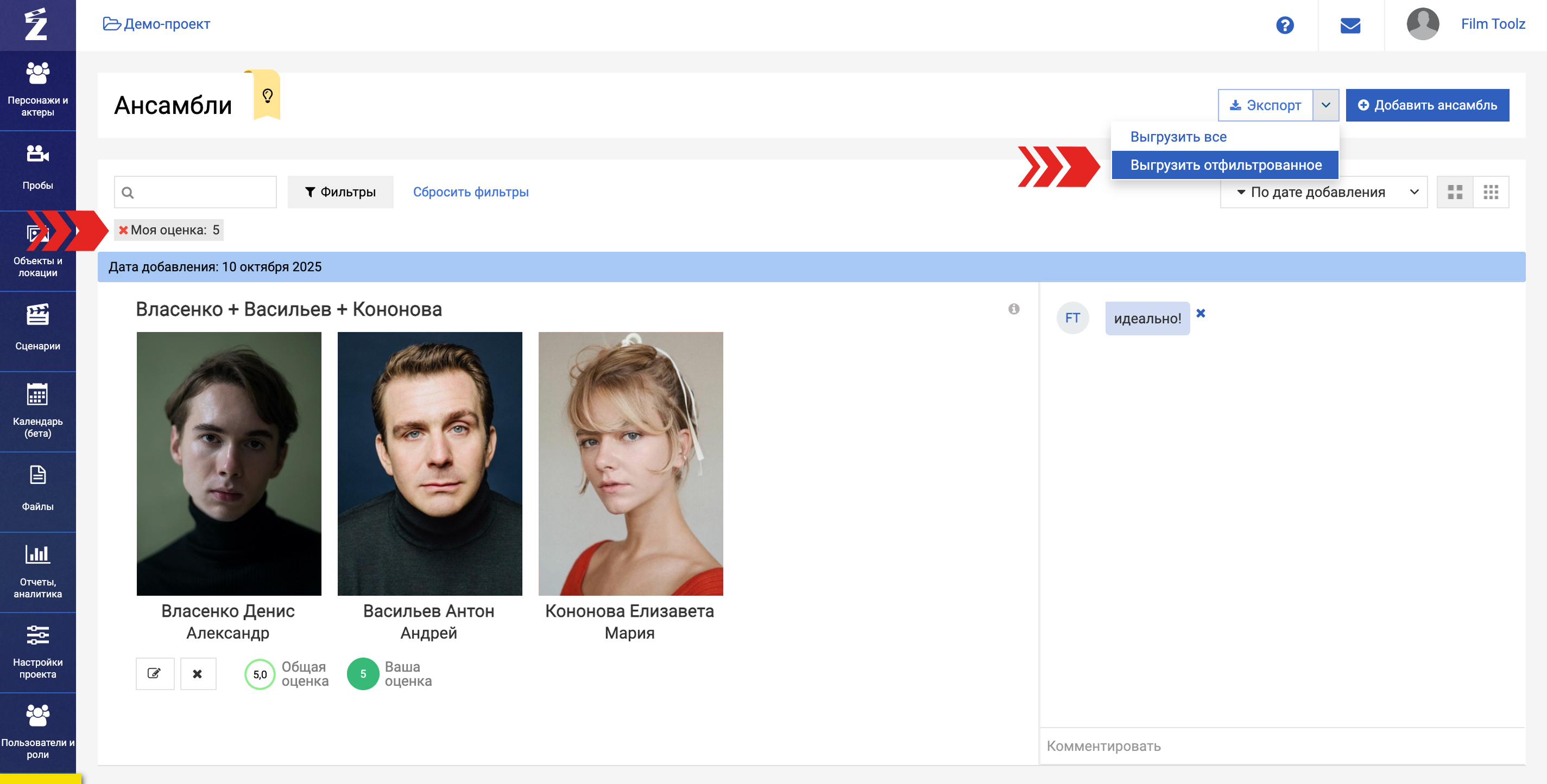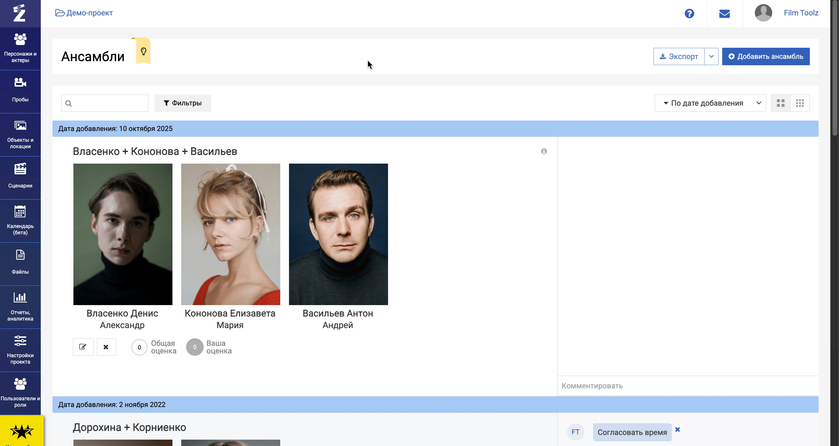 Также вы можете отфильтровать ансамбли по наличию в них конкретных актеров и персонажей, используя кнопку Фильтры.