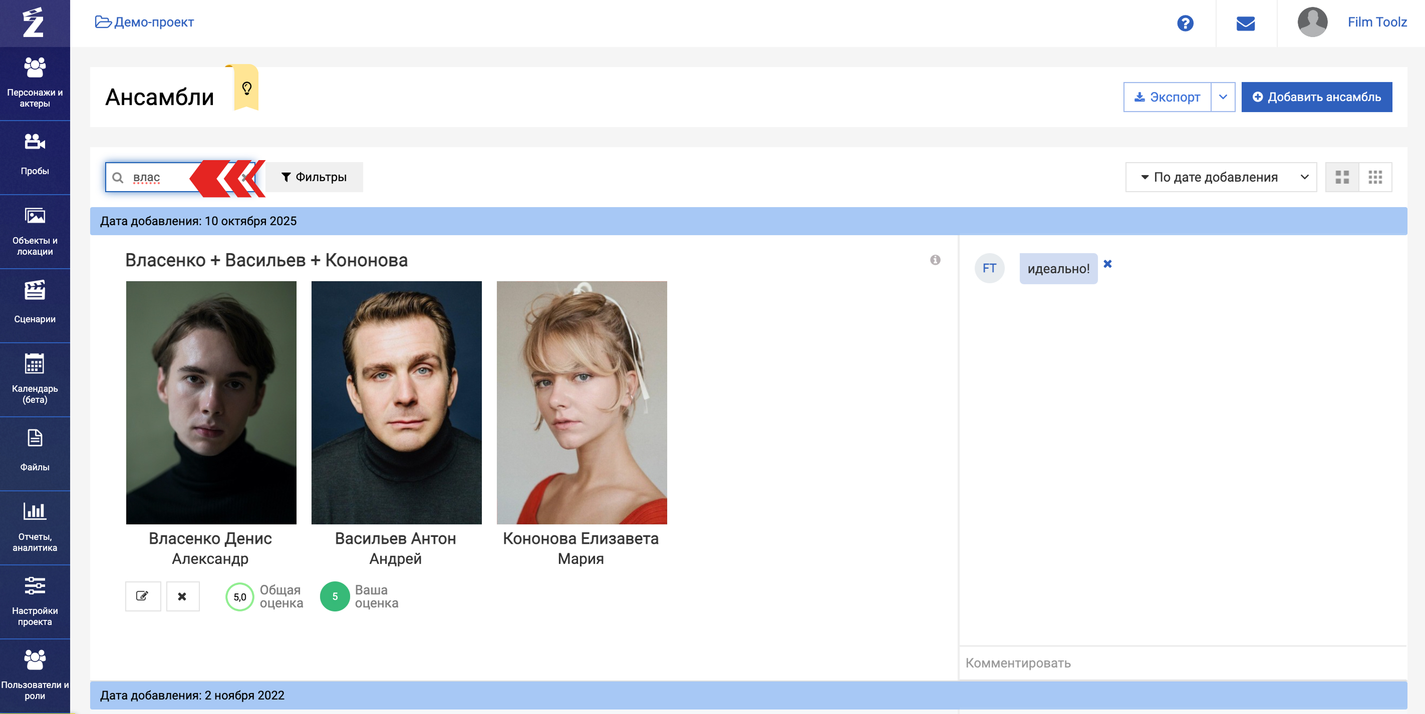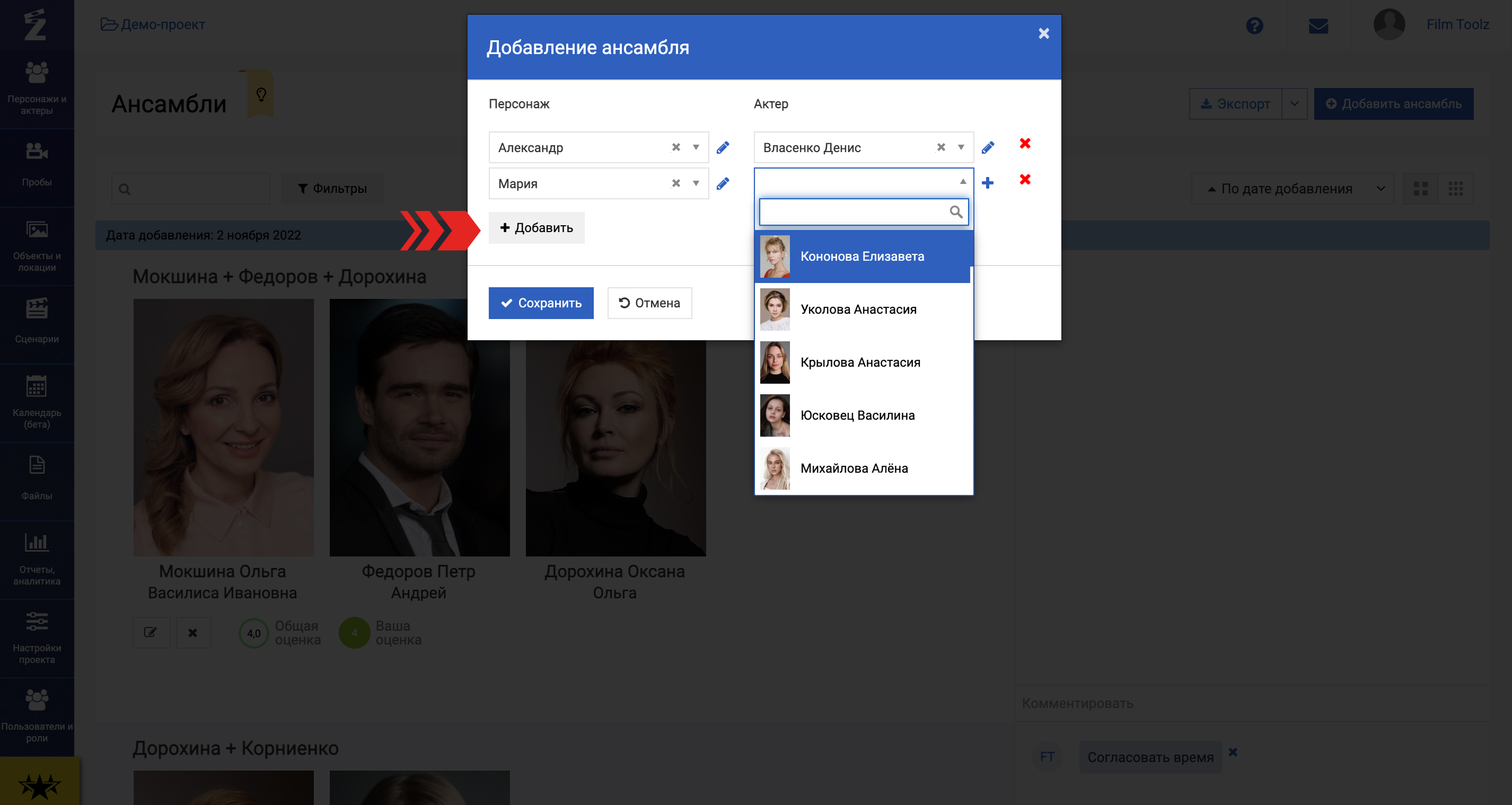 Чтобы быстро найти актера или персонажа в ансамблях, начните вводить его имя в поле поиска и система отфильтрует подходящих.