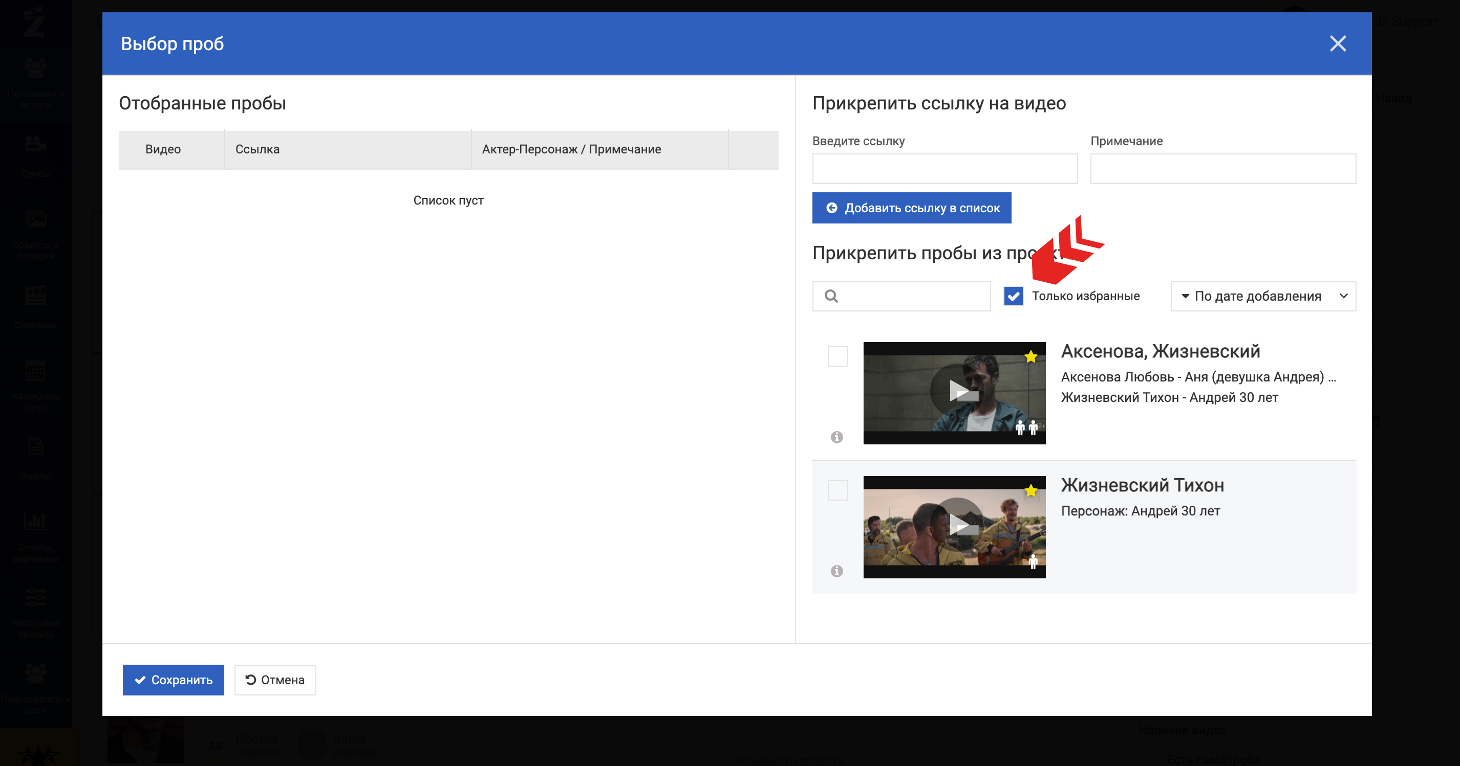 В открывшемся окне, в блоке “Прикрепить пробы из проекта” выводится список всех проб актера на данного персонажа. Вы можете отфильтровать только избранные пробы (отмеченные вами звездочкой),