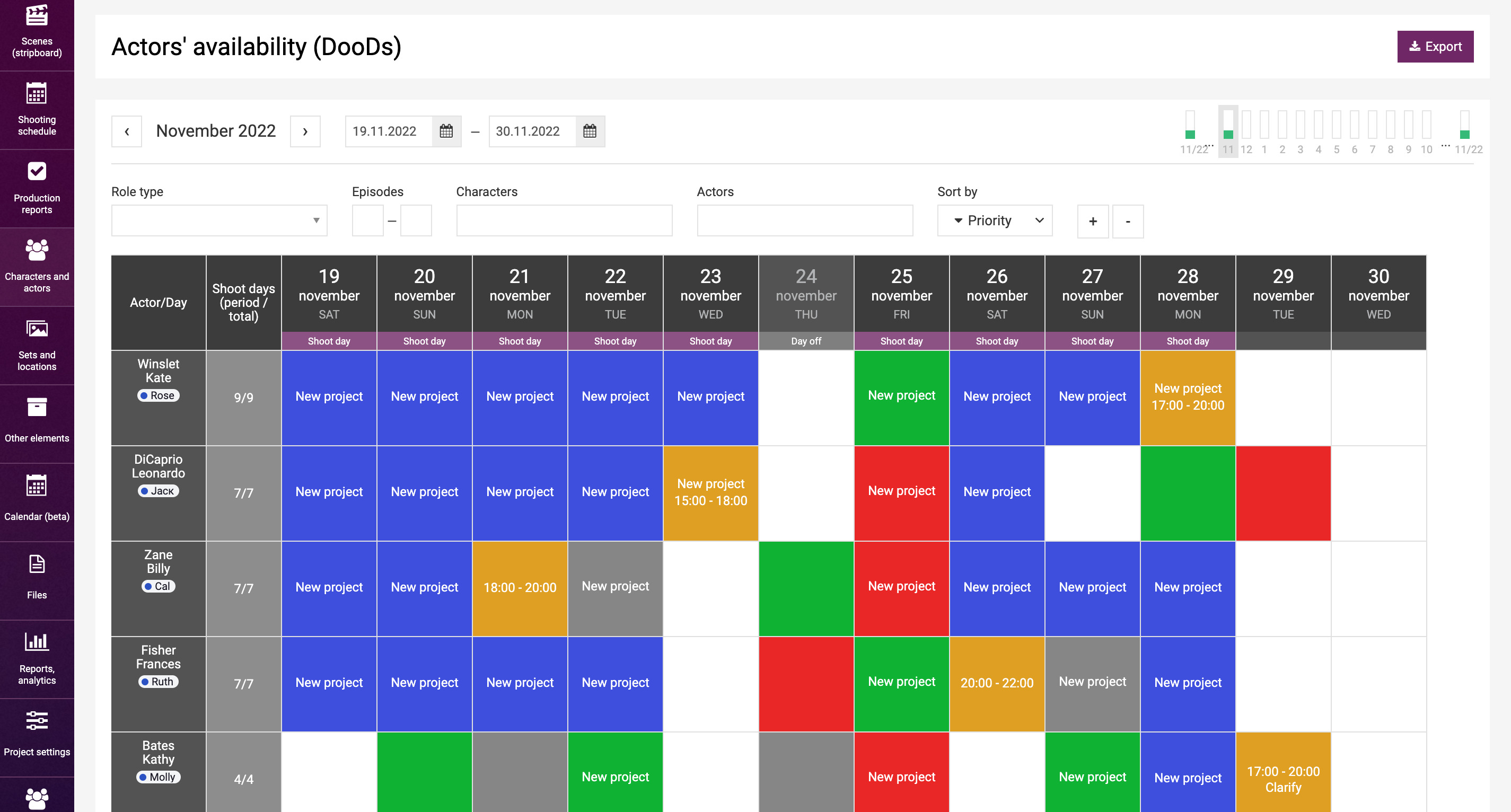 We have updated the appearance of actors' availability and added the ability to add comments in bulk for several days at once. The problem with the calendar header shifting relative to cells has also been fixed.