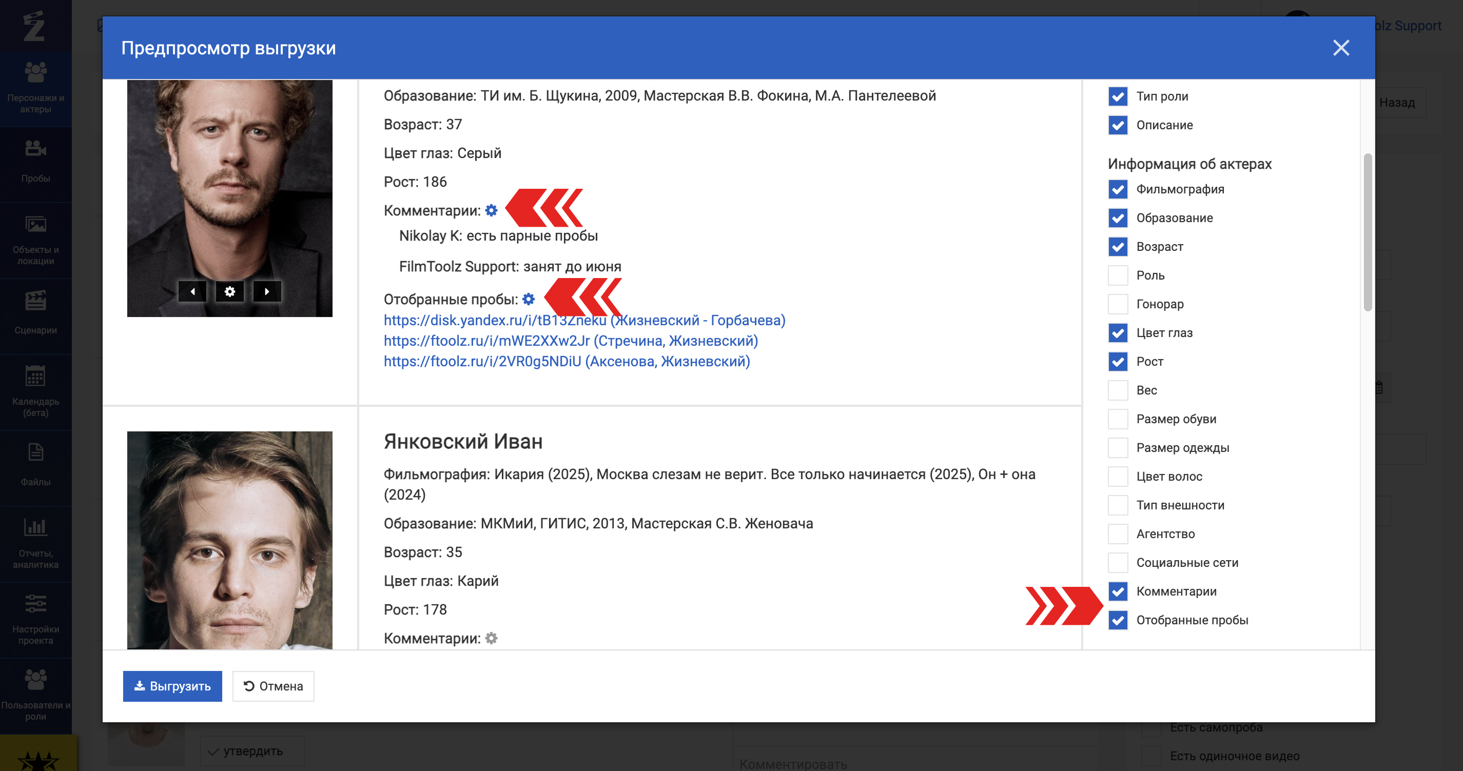 Теперь при экспорте каст-листов вы можете настроить, какие пробы и комментарии выводить в выгрузке.