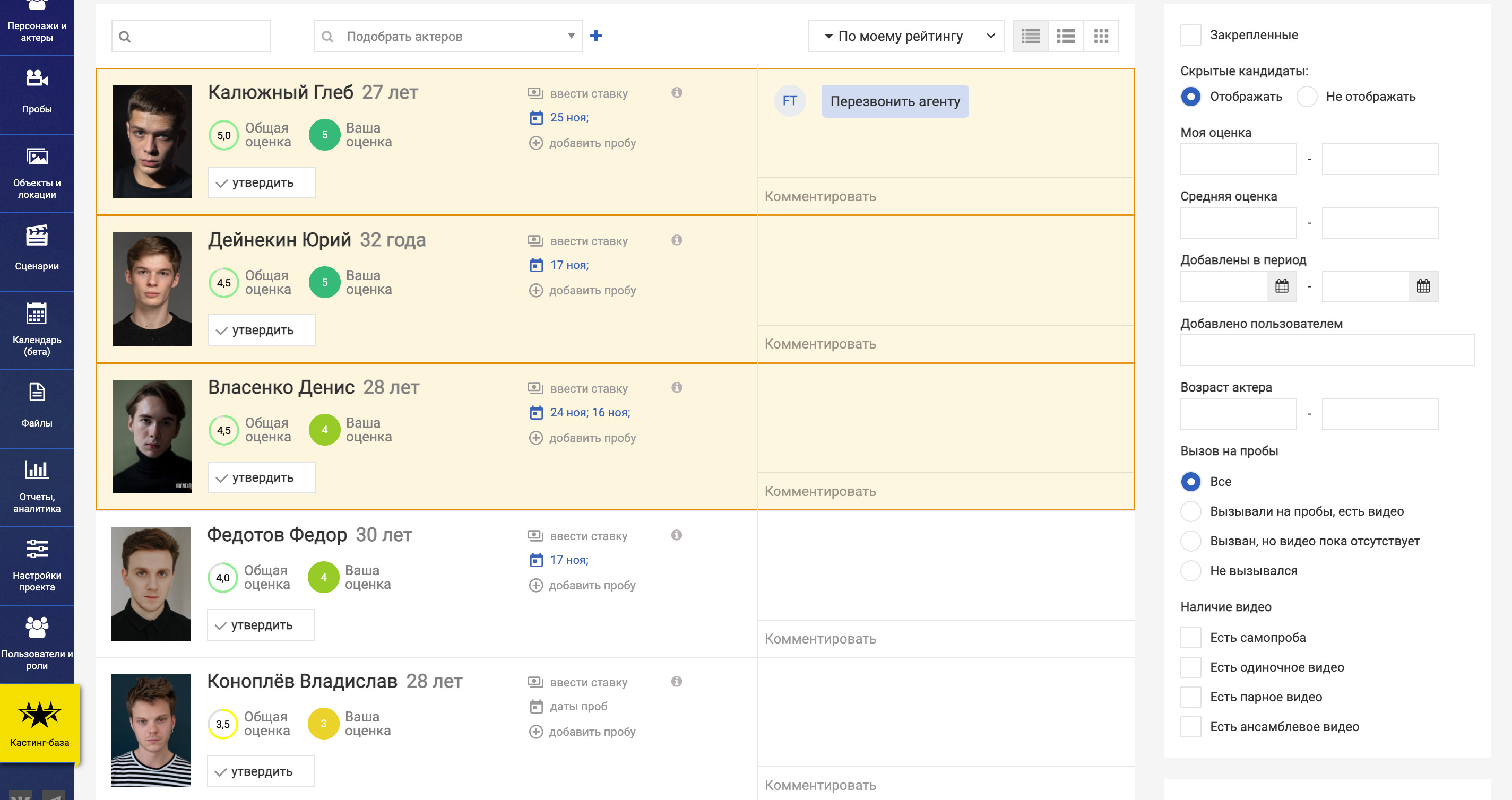 Теперь при работе с кандидатами вы можете закрепить определенных актеров за персонажем, чтобы они выводились в верхней части списка (бежевым цветом):